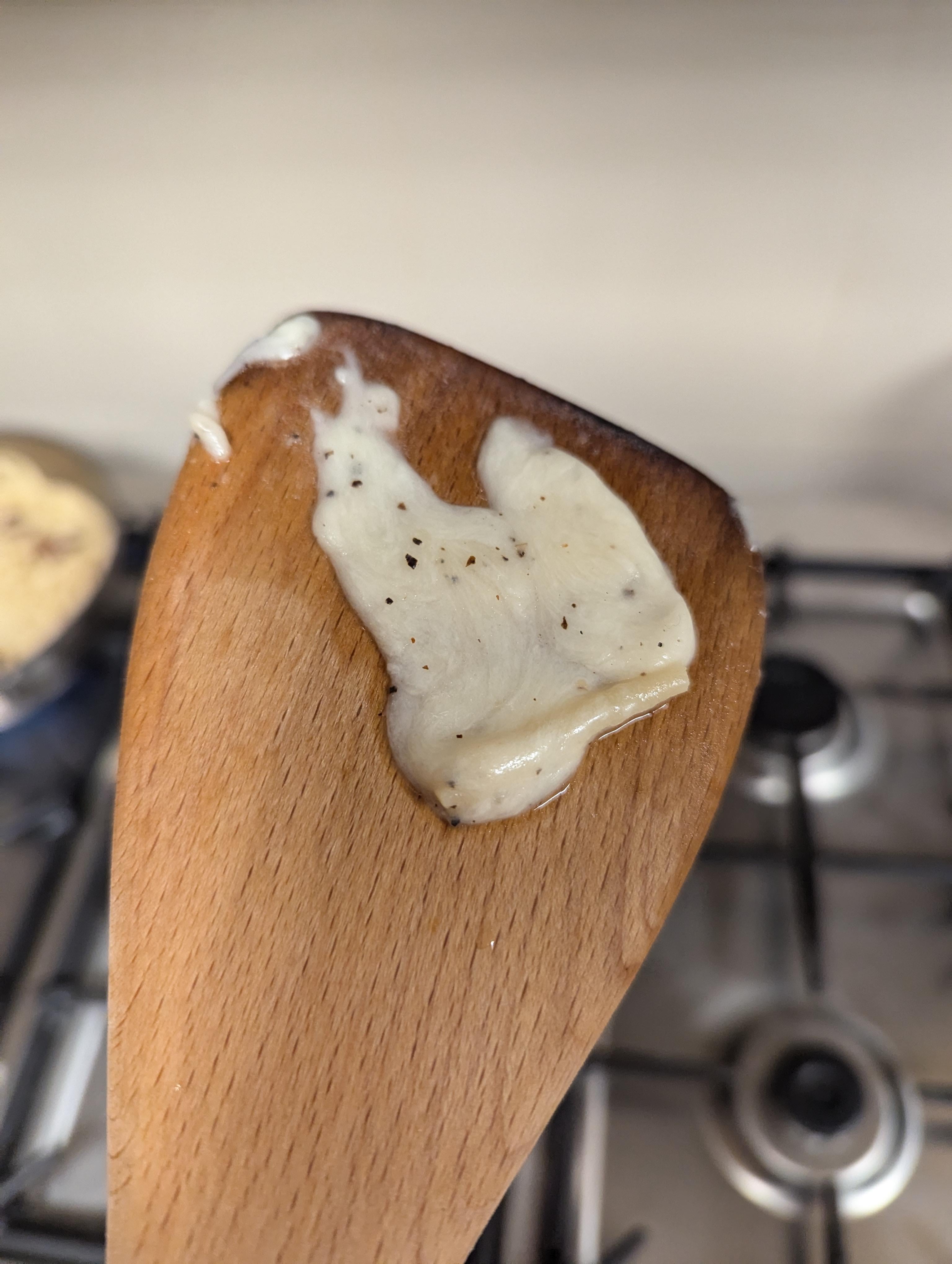 Once slightly cooled, add the cooled water to your pecorino and pepper bowl, adding only a small amount at a time and stirring. Yiu want to get it into a paste. It should not be liquid.