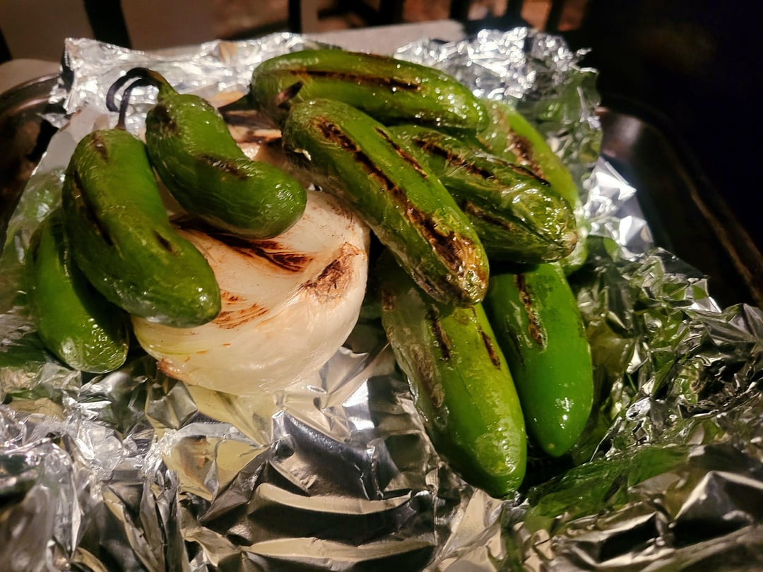 - Put the peppers and onion halves on the tray as they finish grilling, then fold the foil over to create a pocket. Let them sit and steam in the foil until cool enough to handle.