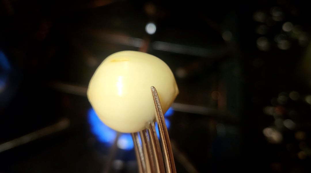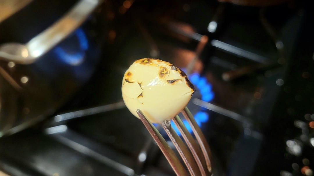 - Slightly char the garlic cloves over a flame and add them to a food processor along with the vinegar, juices in the pan, and 1 of the peppers. Process until garlic is in very small pieces.