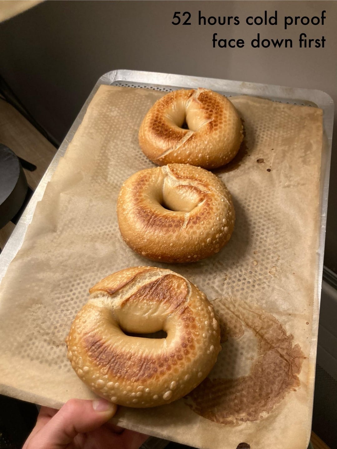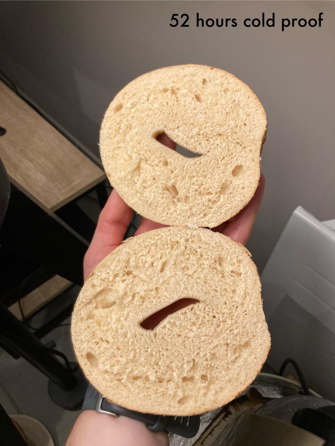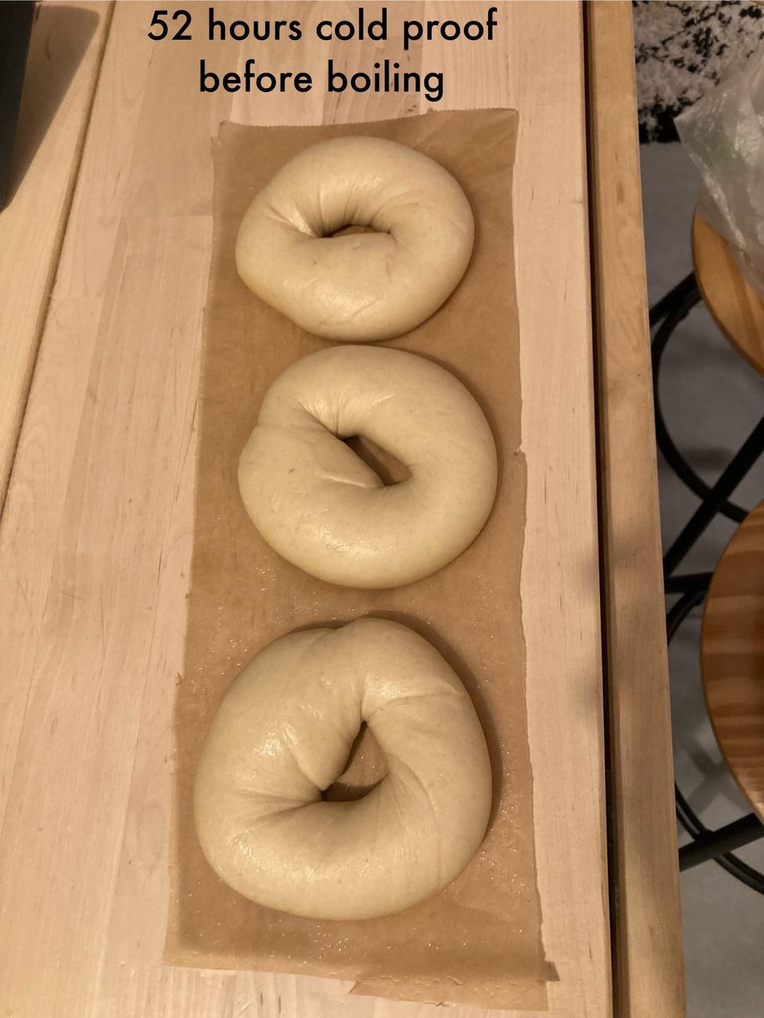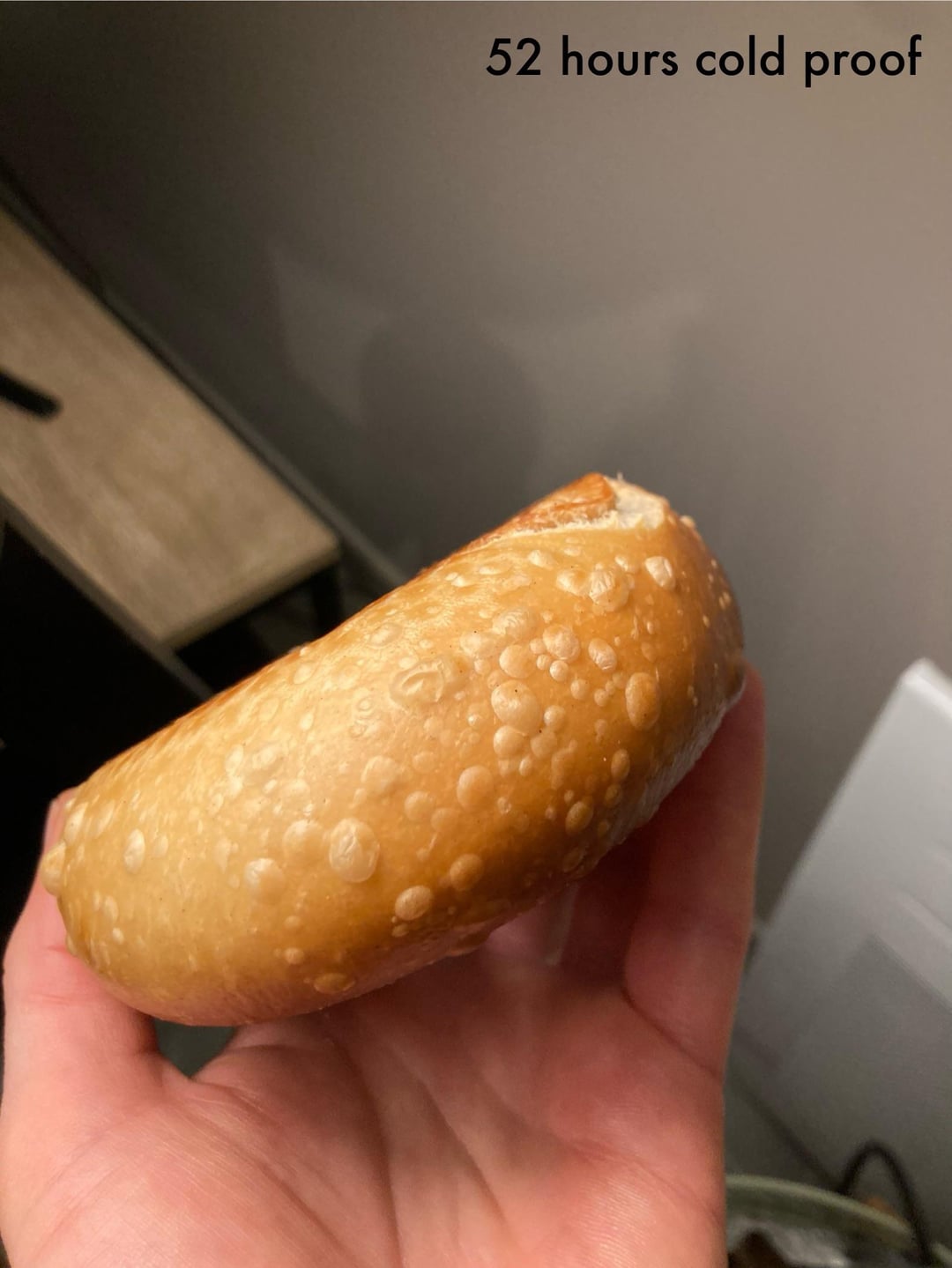 All 6 bagels were made from the same dough, baked at 250ºC in a conventional oven (I poured boiling water in a tray to create steal). I tried to flip the 52 hours one to mimic bagel boards but it mess with the visual.