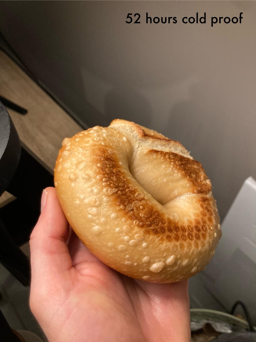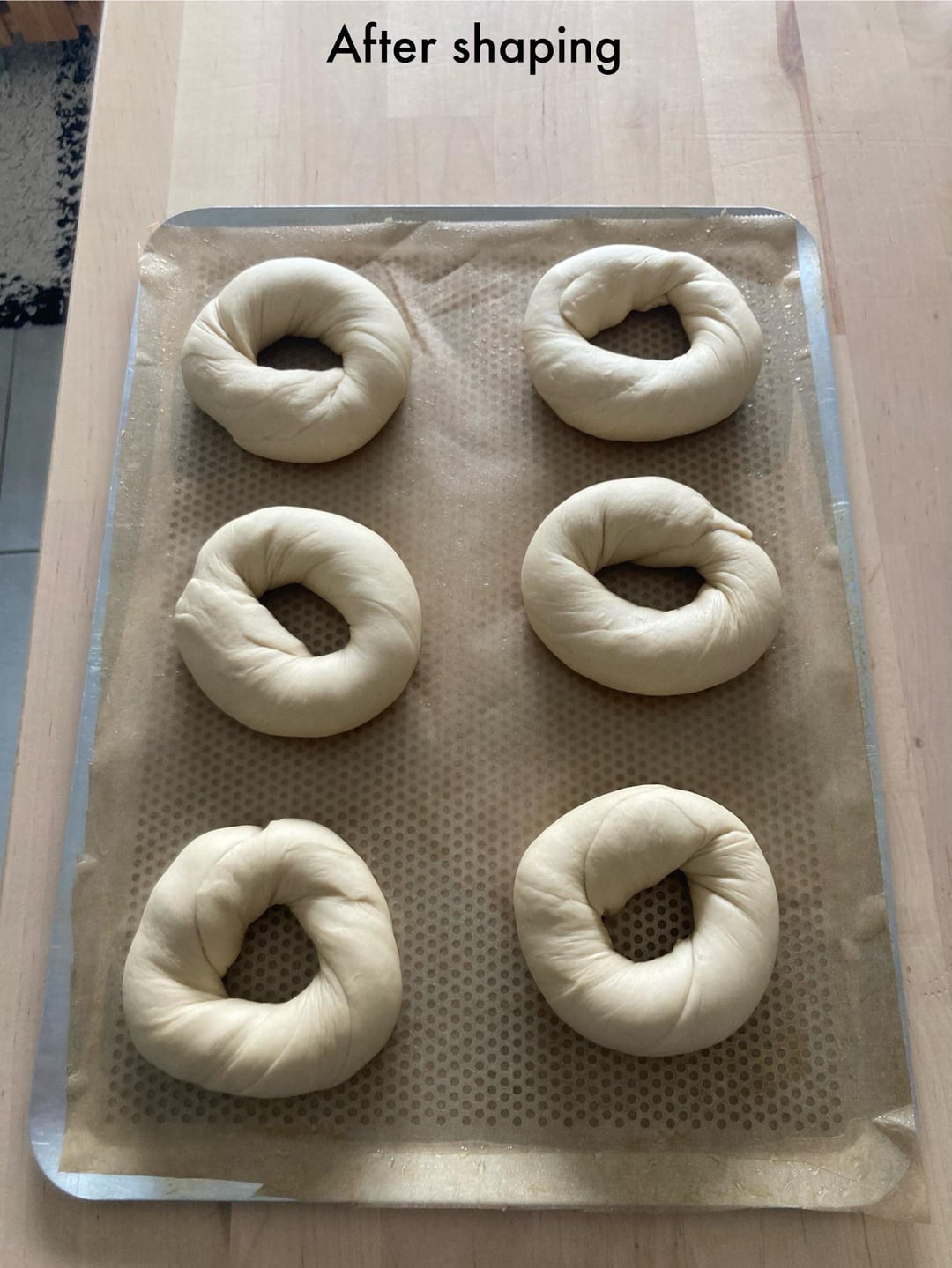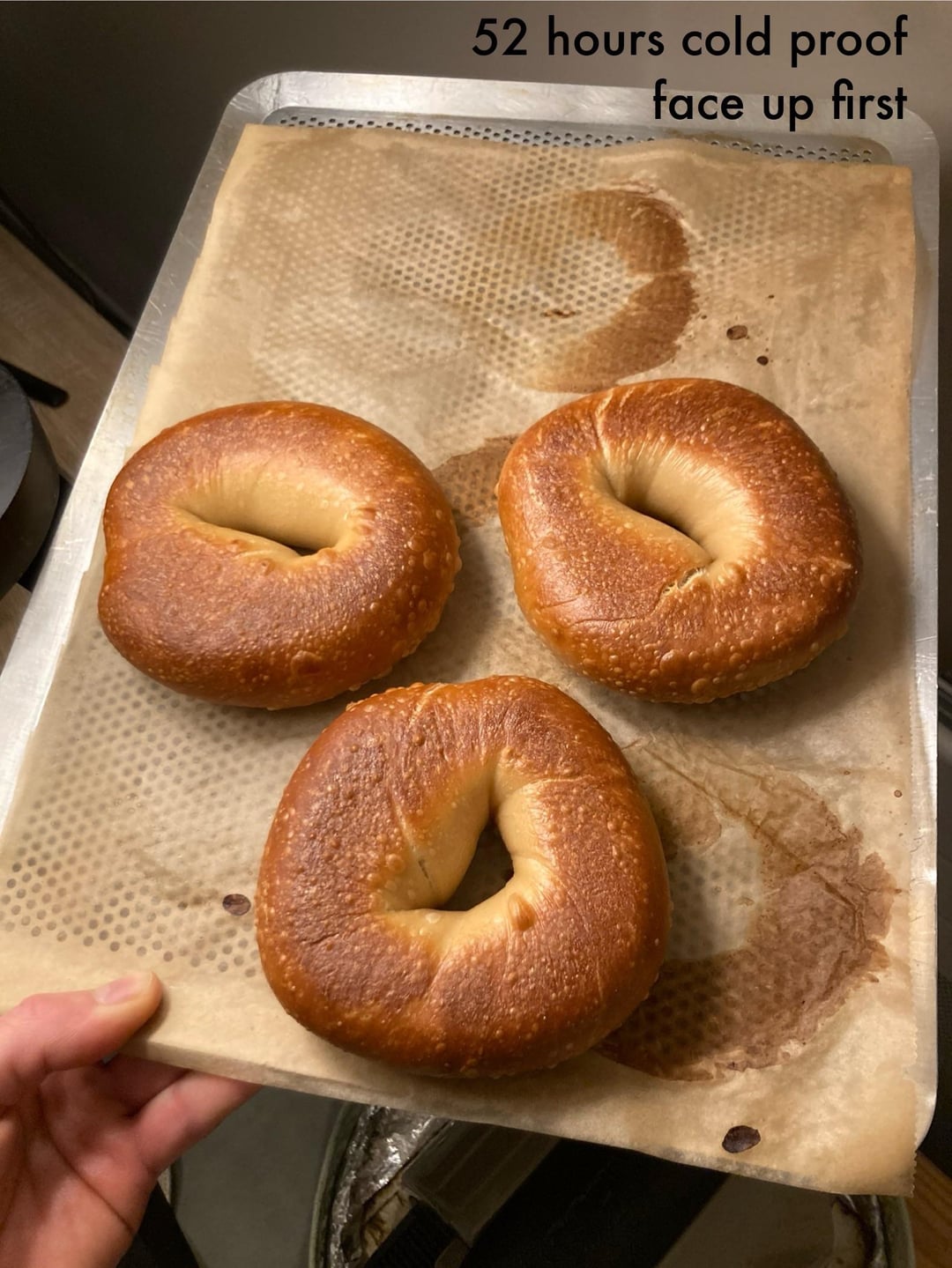 All 6 bagels were made from the same dough, baked at 250ºC in a conventional oven (I poured boiling water in a tray to create steal). I tried to flip the 52 hours one to mimic bagel boards but it mess with the visual.