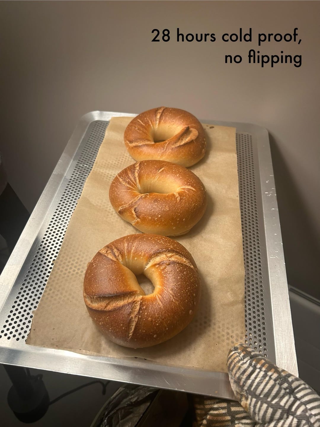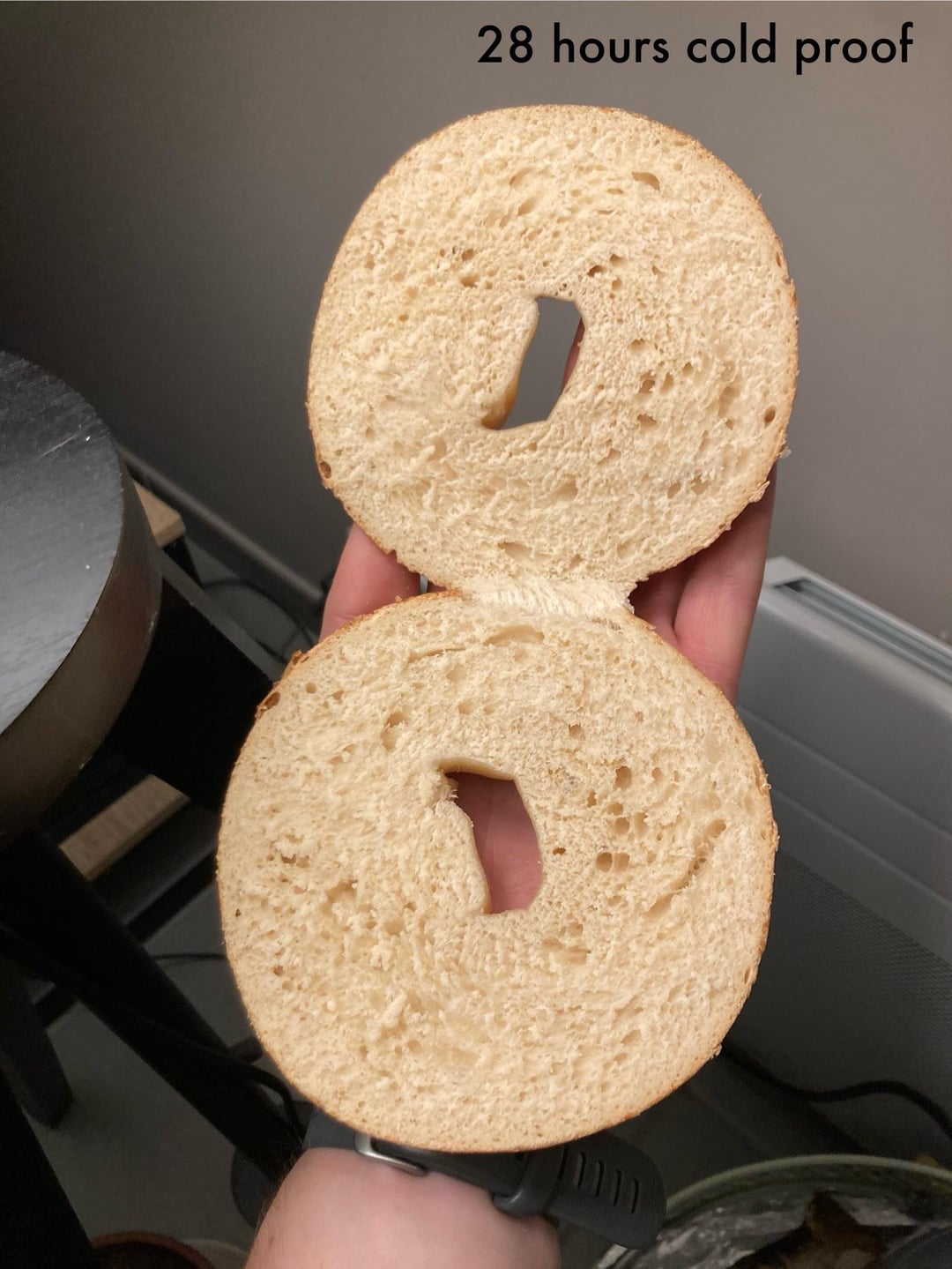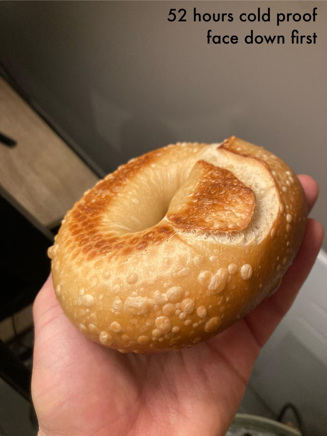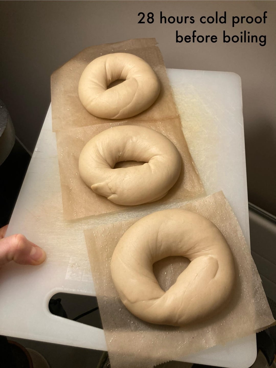 All 6 bagels were made from the same dough, baked at 250ºC in a conventional oven (I poured boiling water in a tray to create steal). I tried to flip the 52 hours one to mimic bagel boards but it mess with the visual.