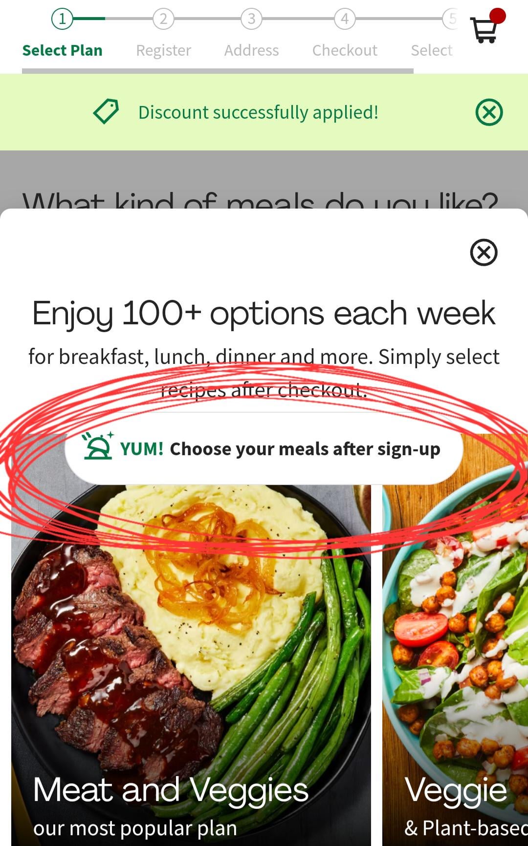 And people say "just click to view menu" but when I do that it shows me the different menu types. I click on the one I like and nothing moves/changes, except for the text box that reads "view our menu after sign-up". Of course CHECK OUT (pay) is before SELECT (view the menu).