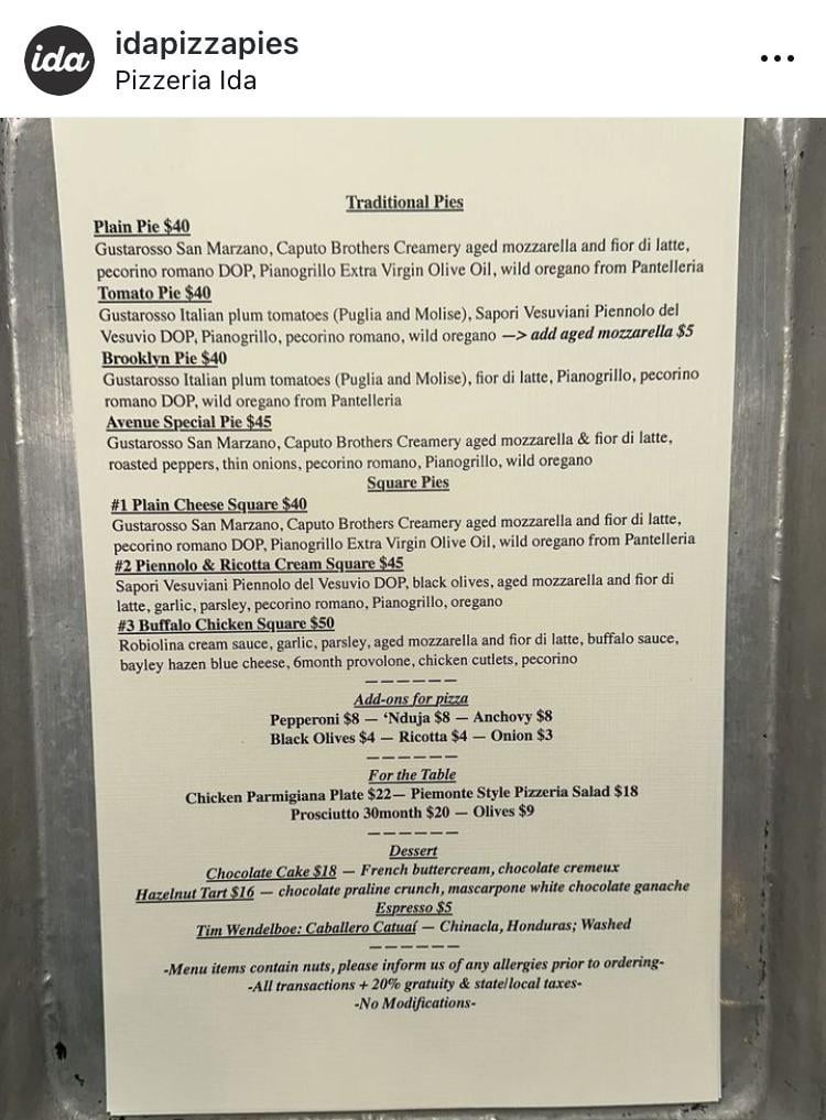 Auto gratuities, a nutso owner, can’t get the sandwich without getting a pizza, wild pricing. Is it ridiculously expensive? Yes. Is it the best pizza you will have in your life? Up to you but many say so.
