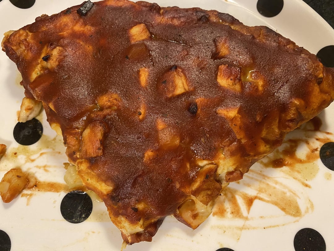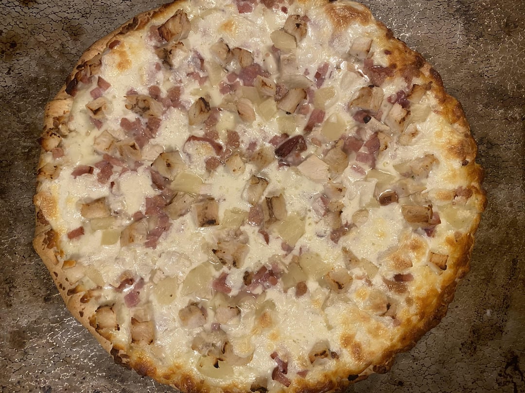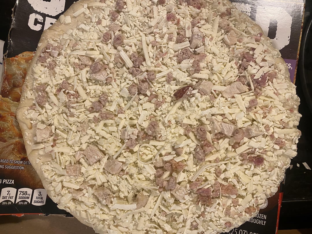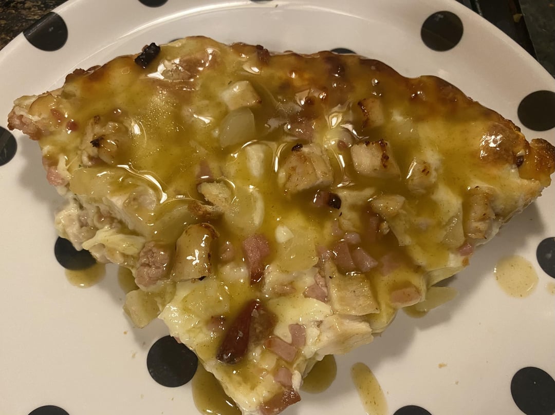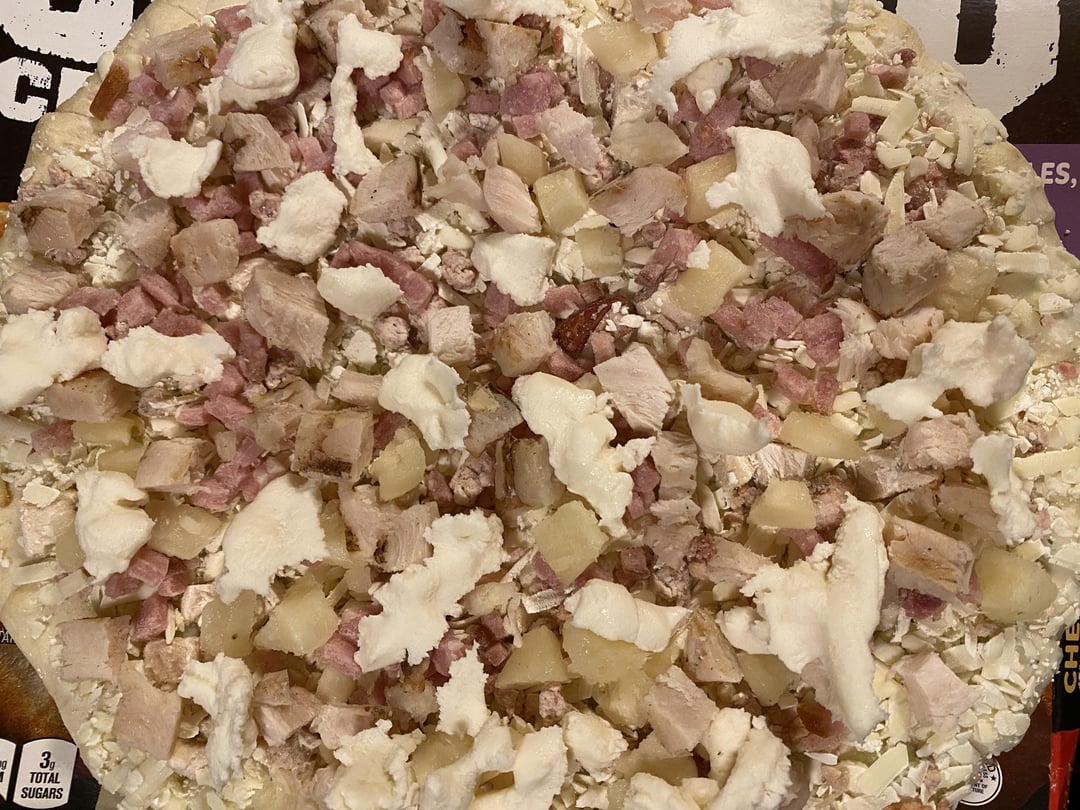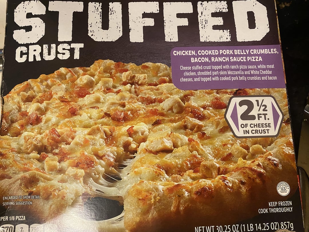 Aldi stuffed crust chicken, bacon, ranch pizza. I add ham, pineapple, and Aldi frozen fajita chicken strips. Also more mozzarella. After it’s cooked I slather my slice in green Tabasco, then sweet tomato basil pizza sauce, and put it in the toaster oven to get the sauce a little cooked.