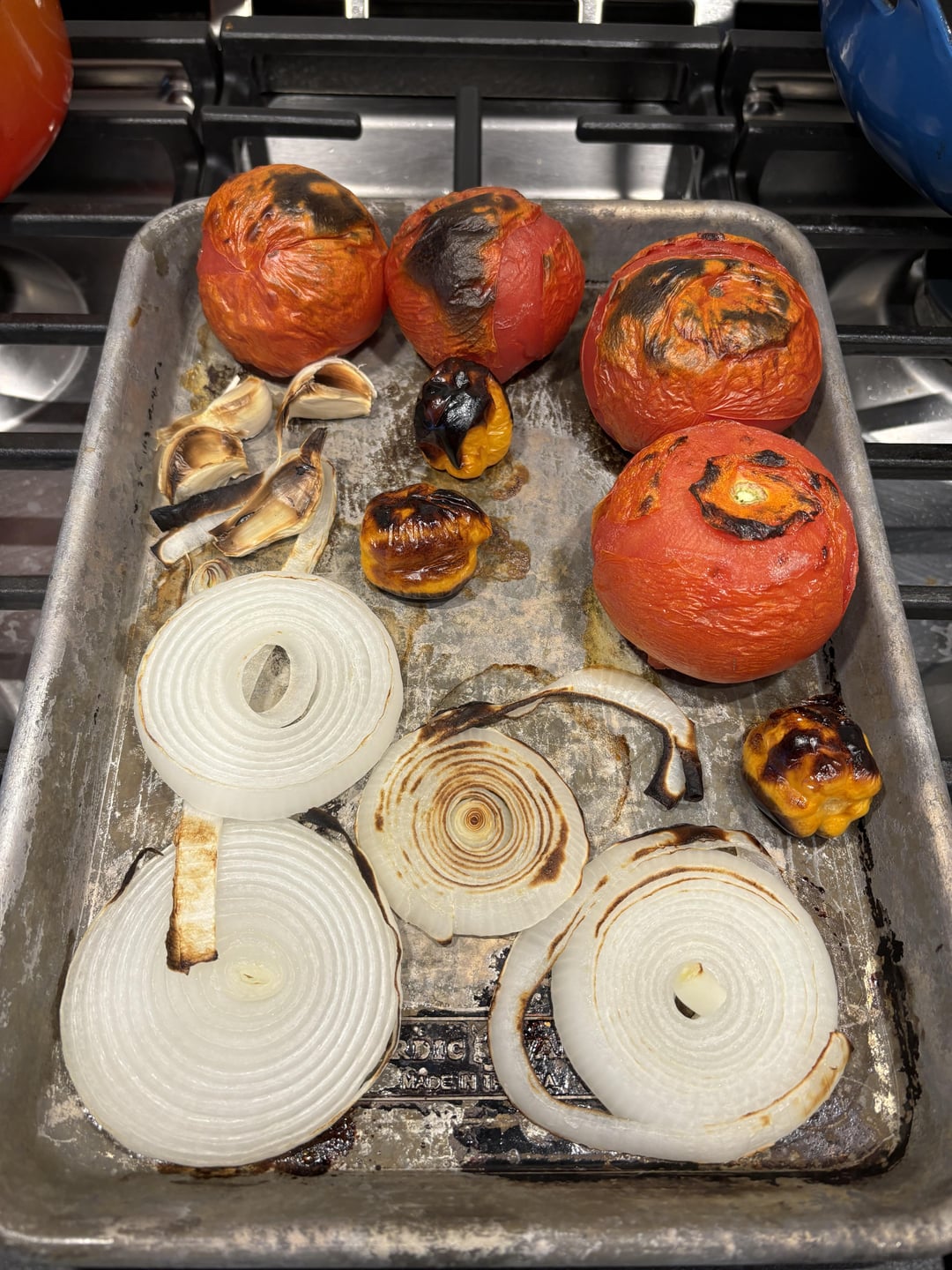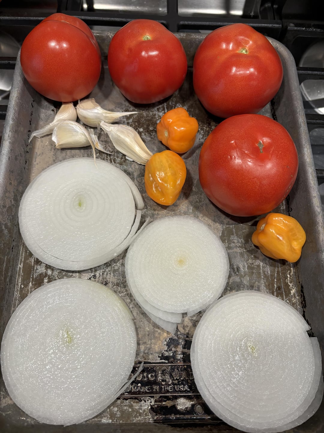 1.25lbs tomato 3 habanero Half white onion thick cut 4 cloves of garlic