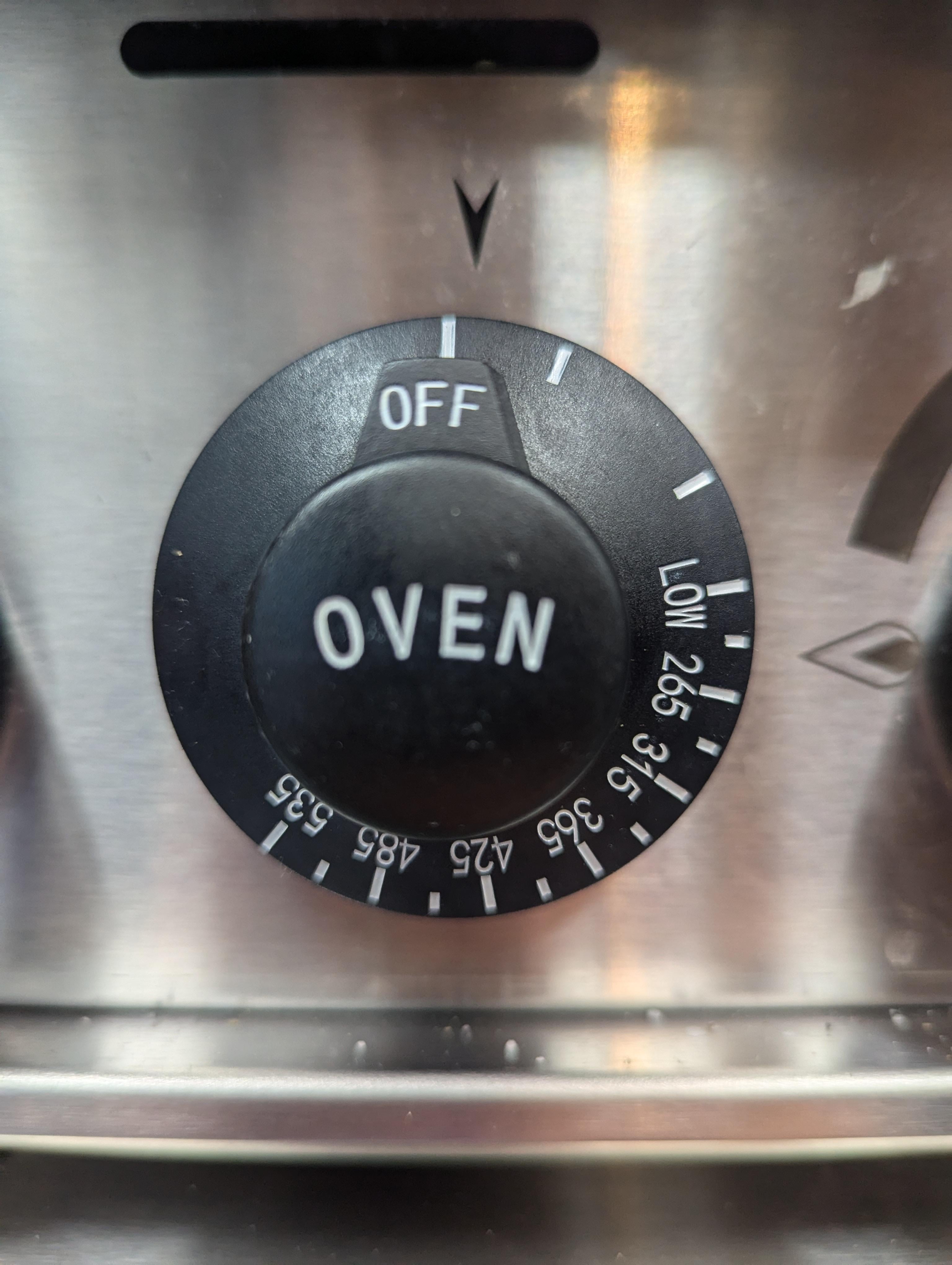 This stove was actually designed by a chef who left the industry to go be an engineer. He has this vendetta against pastry chefs, so he made a knob that does not specify where the “universal bakers temp” of 350 is at. It is both an extremely elaborate way to get back at his arch enemies, and also a lie that I just came up with. I have no real explanation.
