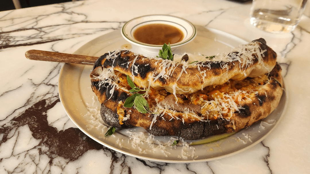 I've never been there for lunch before but found this thing today. It looks a little rough, but this pizza dough sandwich is worth a try. Bread, beef, and peppers were all very good. I regret not asking if they would have dipped it for me…