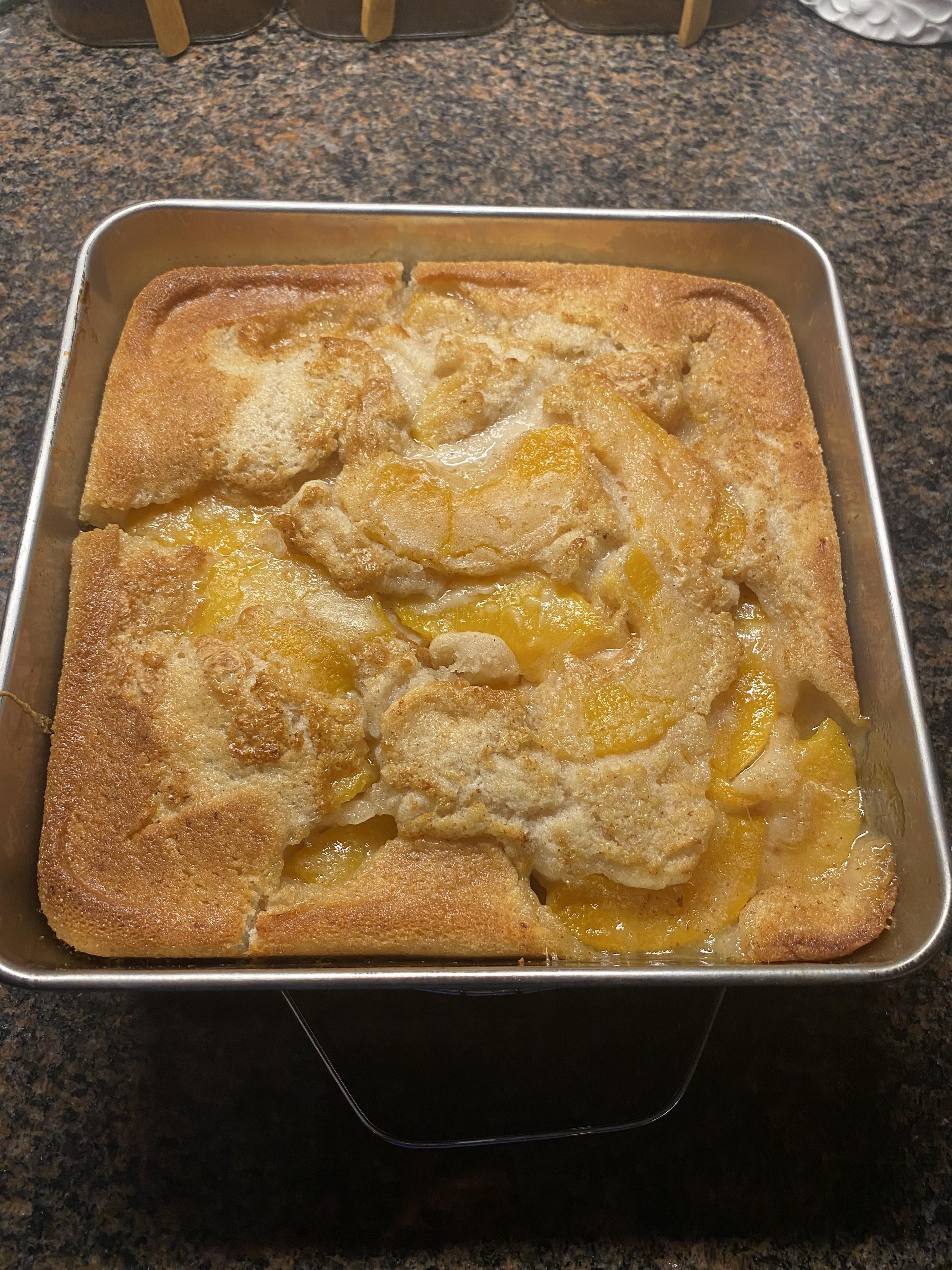 3. Pour peaches into pan
