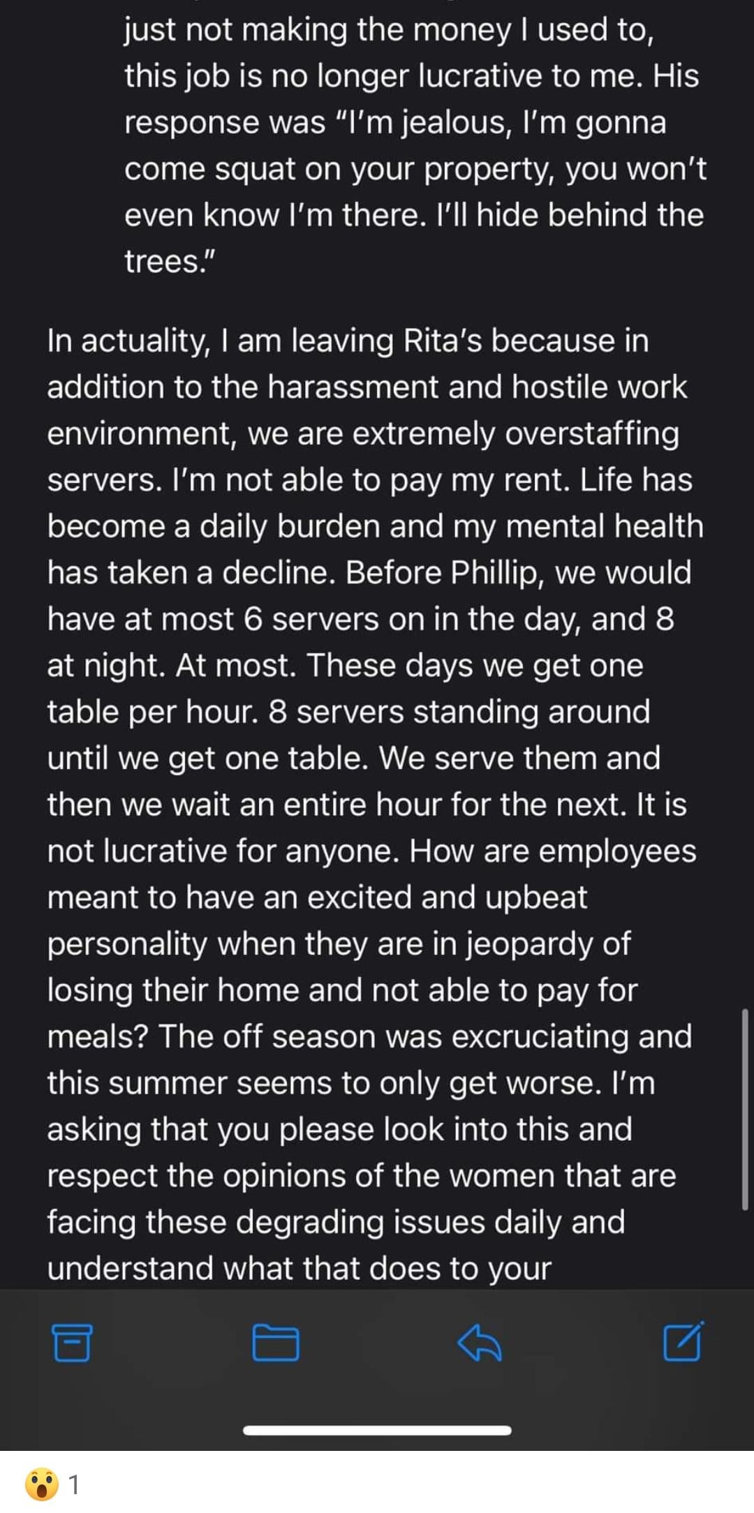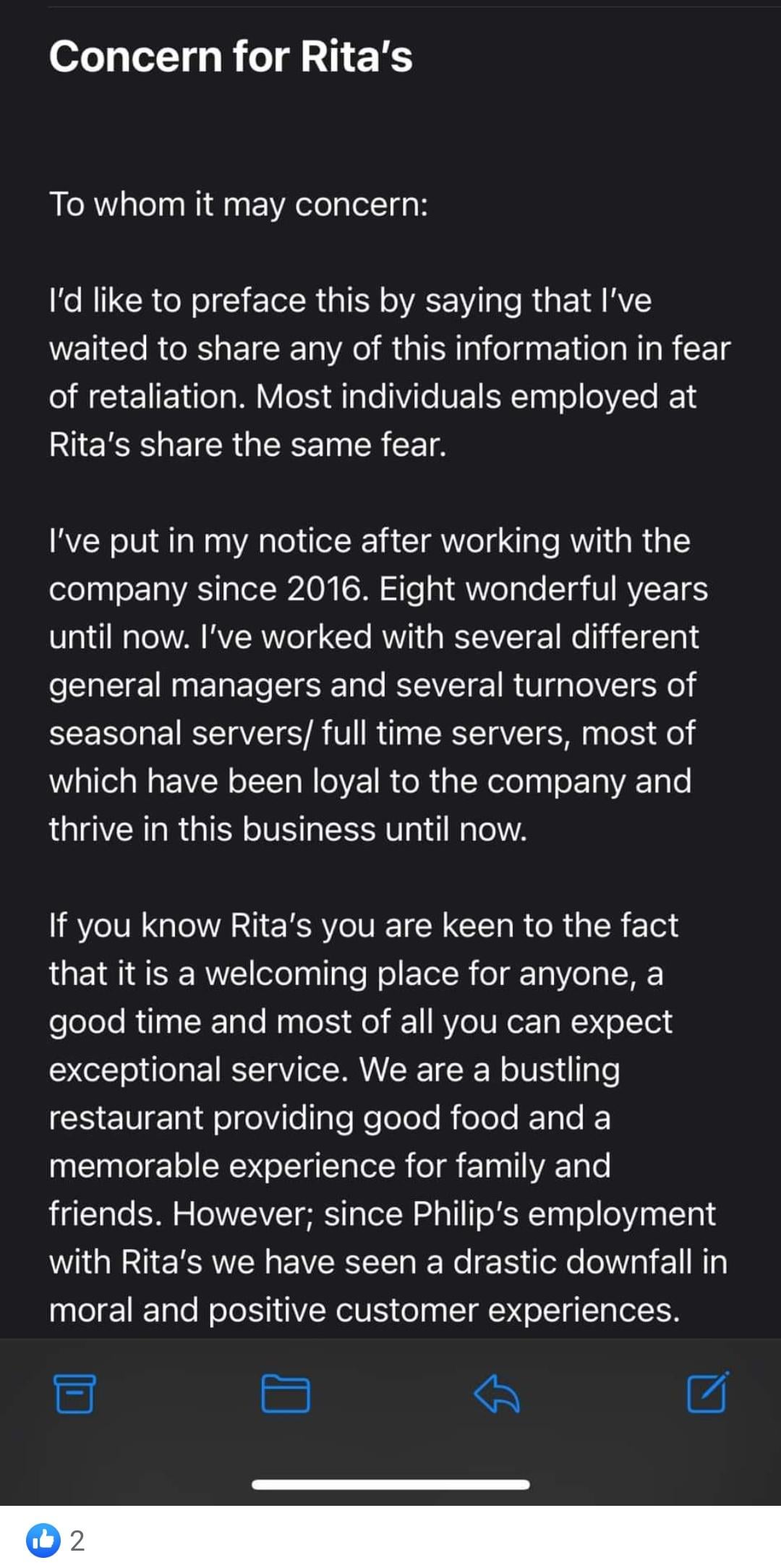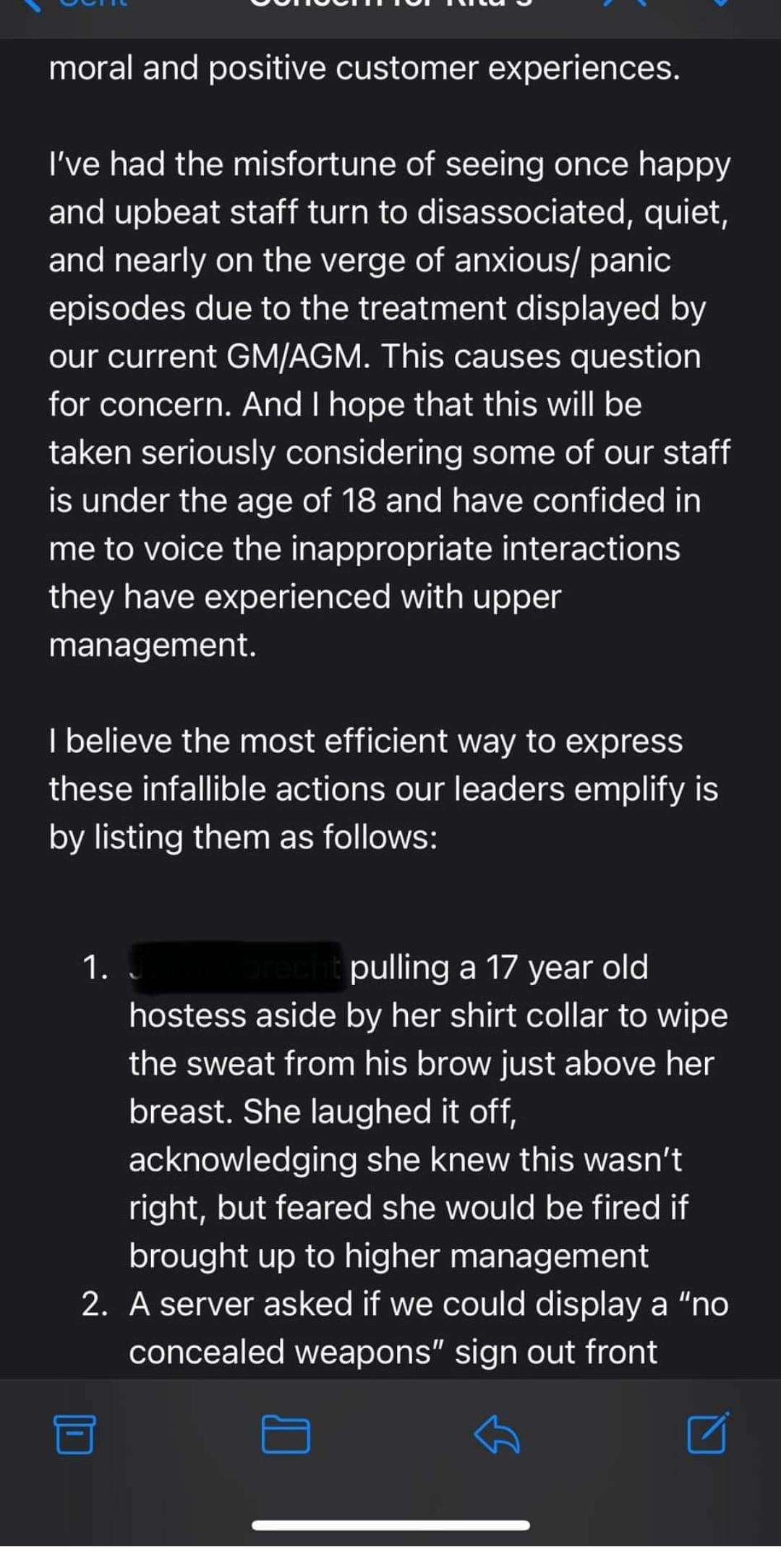 Id like to say this is not my email and I am not affiliated with Ritas. Im sharing on behalf of my Fellow F&B workers in Charleston SC.