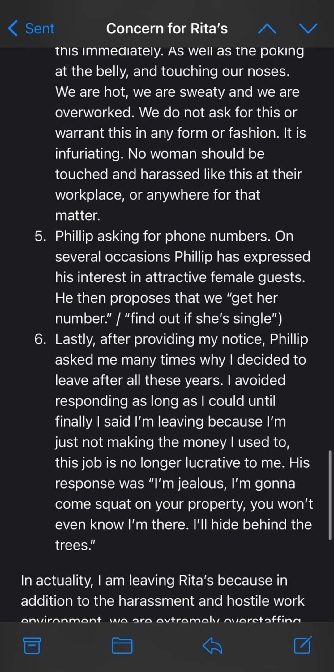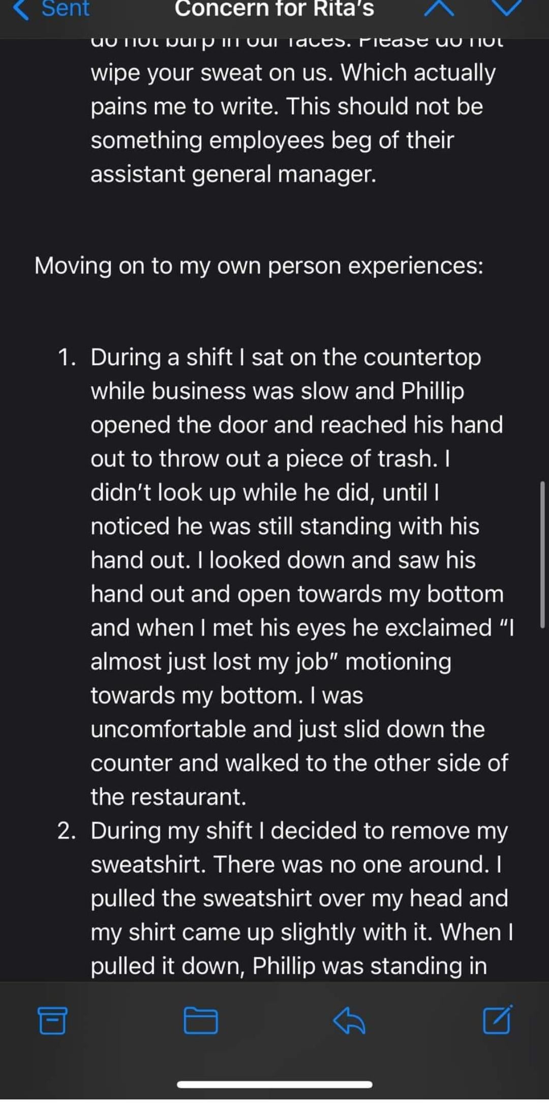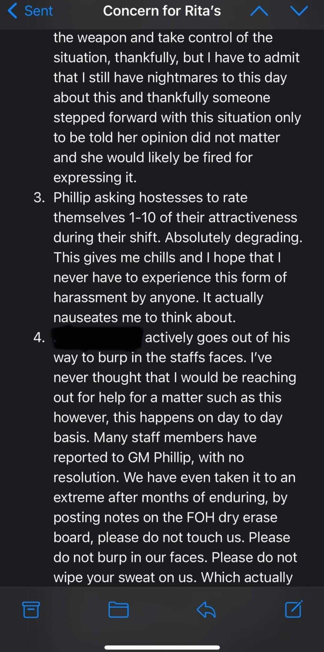 Id like to say this is not my email and I am not affiliated with Ritas. Im sharing on behalf of my Fellow F&B workers in Charleston SC.