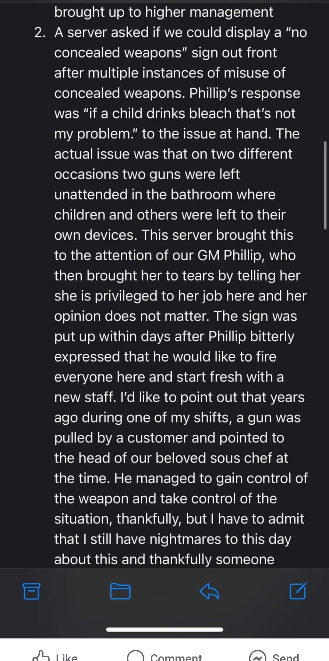 Good fucking lord, this place is a nightmare…. Why are we so casually listing shit out like, ‘a gun was pulled out and pointed at a chef, but he managed to gain control of the situation’?!? No one should ever work or even set foot in this establishment.