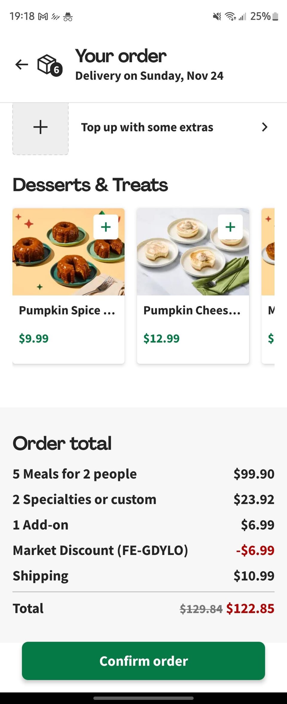 The price for the specialty meals are <base rate> ***+ $4.99***, so if the meals are normally $20 for two, the specialty price for the meal (two servings) would be $29.98. It looks like you have 6 meals: so 5 would be at regular price and maybe the 6th has a base rate of about $12 or $13 +9.98 + tax?