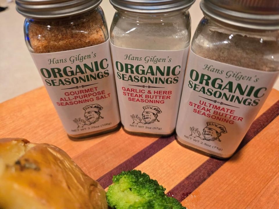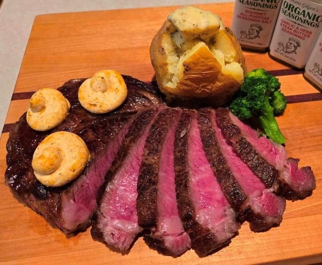 Got some great FRESH steaks and ORGANIC SEASONINGS at the local Farmers Market. Seasoned the steak with the GOURMET ALL-PURPOSE SEASONING SALT, sous vide at 122 degrees for 2.5 hours, patted dry and rubbed with oil, then seared in a hot cast iron pan, and topped it with the ULTIMATE STEAK BUTTER. Baked potato was topped with GARLIC & HERB STEAK BUTTER.