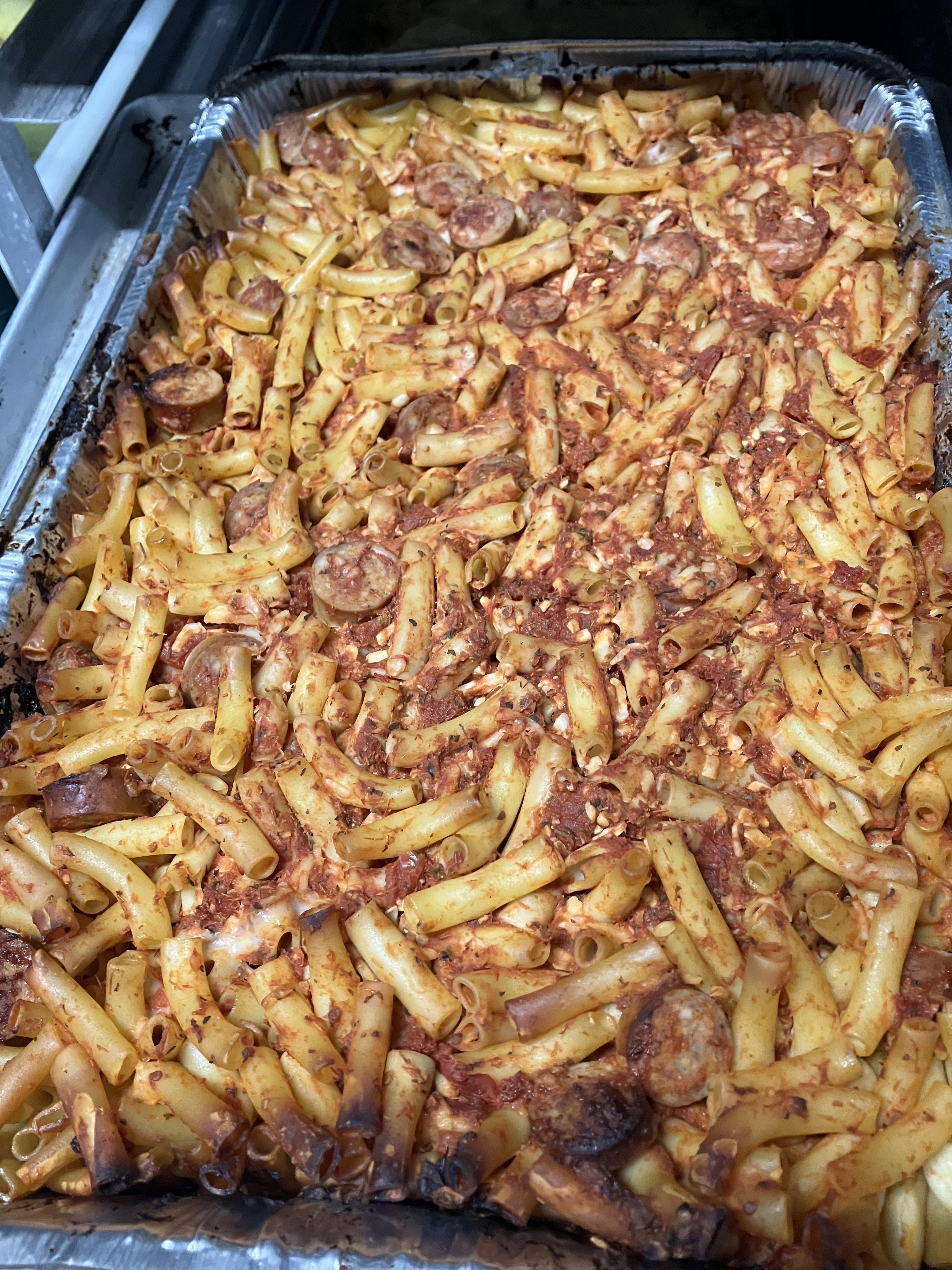 This looks like what you’d get if you decided to re-purpose baked ziti from one buffet to another.