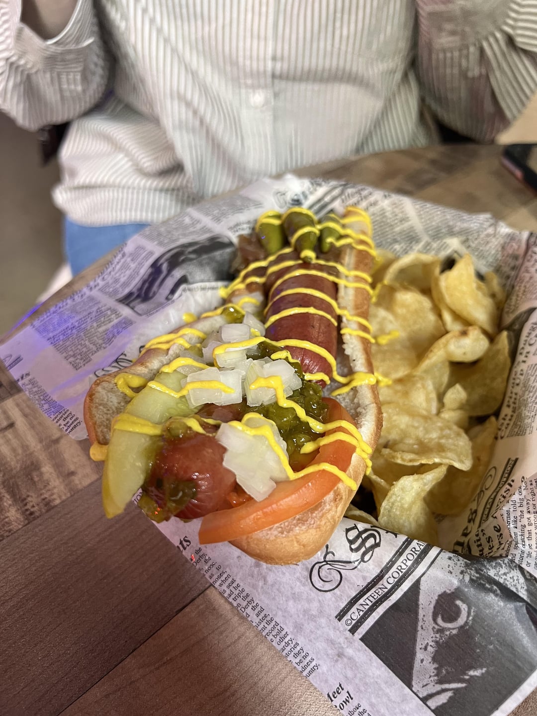 Lunch was a Chicago dog 2 ways at Chicago Brewhouse on the river walk. Half was a classic style Chicago dog and half was a polish dog with carmalized onions.