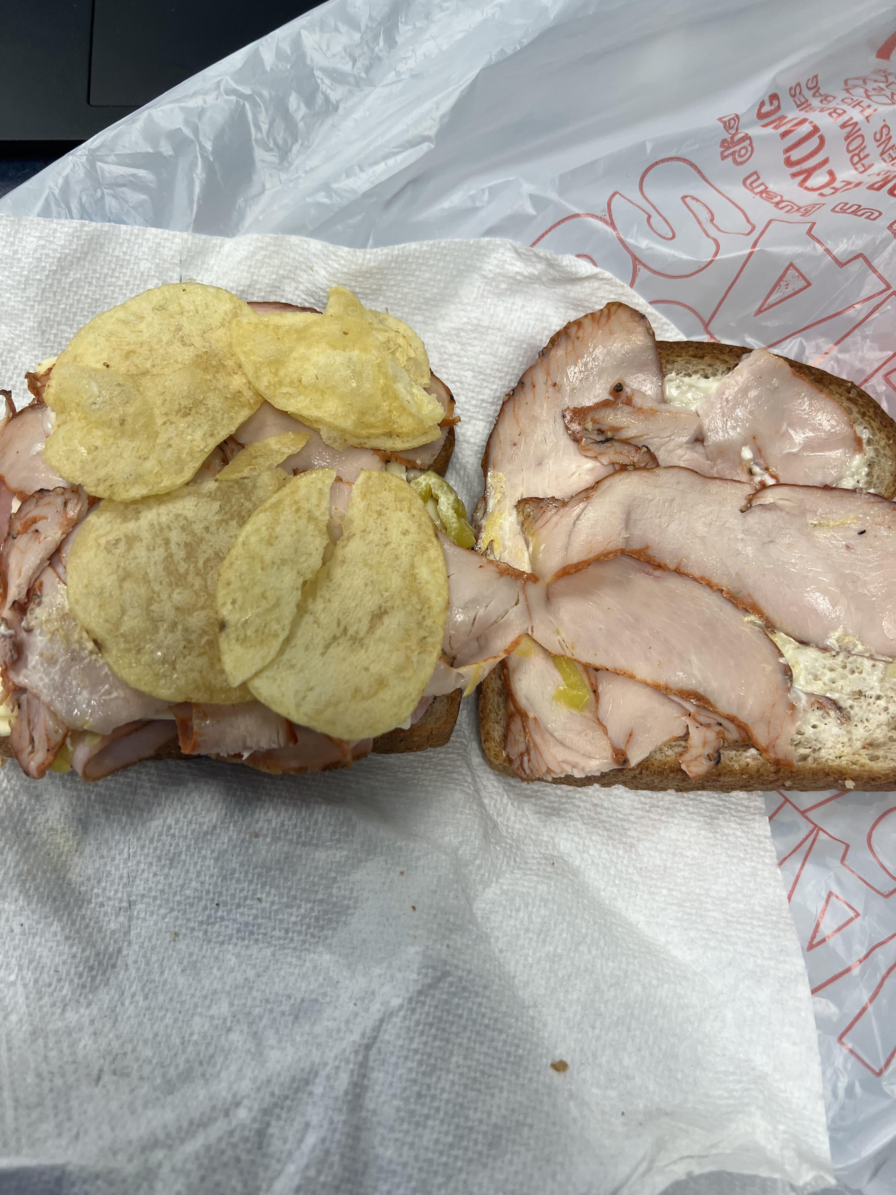 Turkey, american cheese, banana peppers, salt and vinegar chips, mayo and dijon