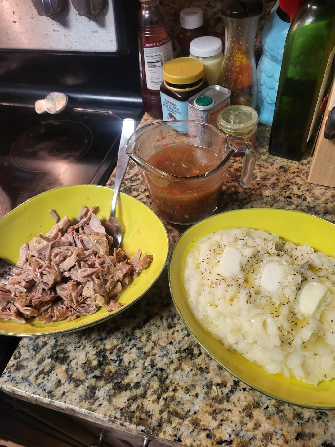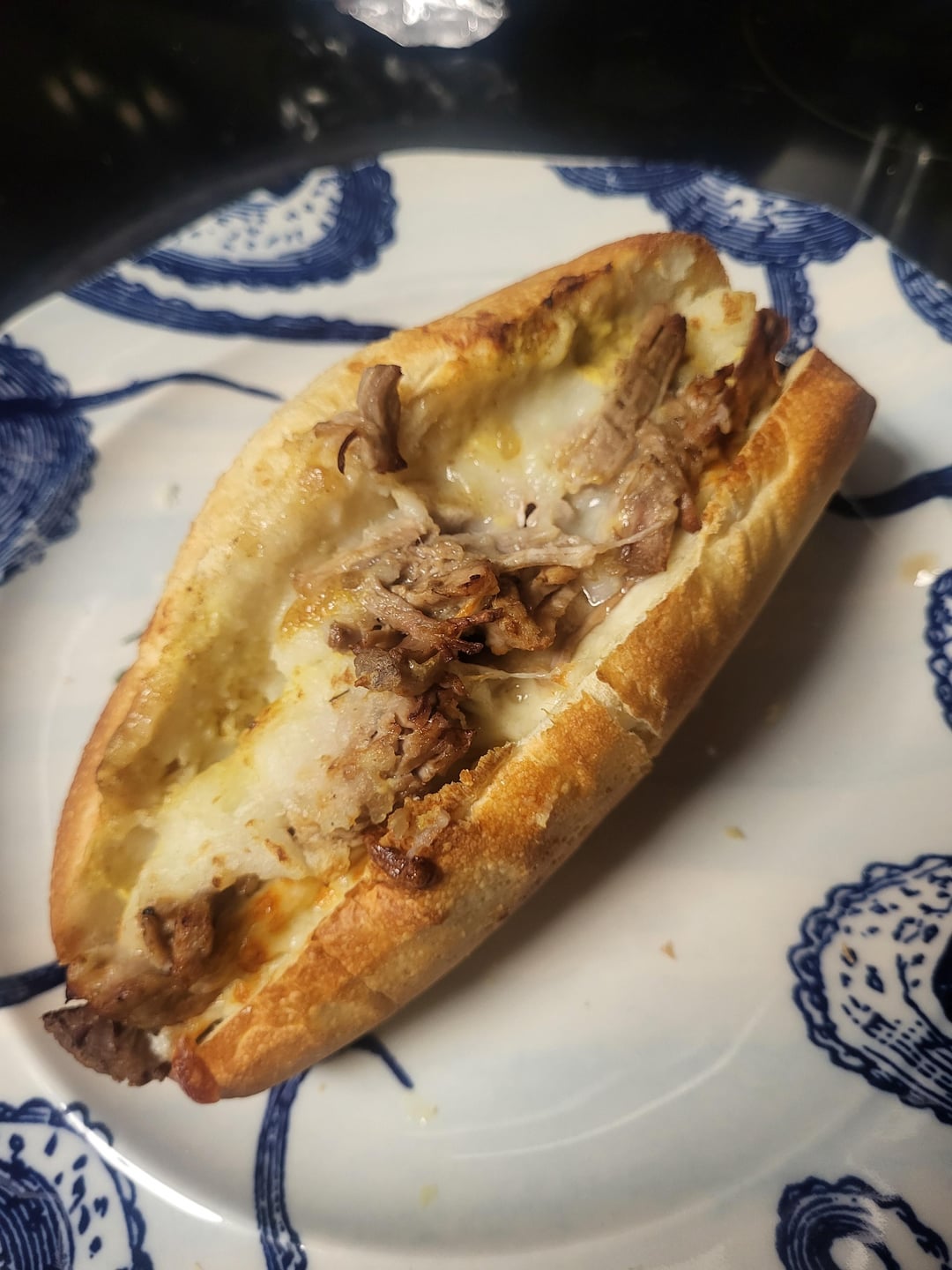 Used leftover shredded pork tenderloin, garlic mashed potatoes, & gravy for a sandwich! (Added shredded mozz and brown mustard)