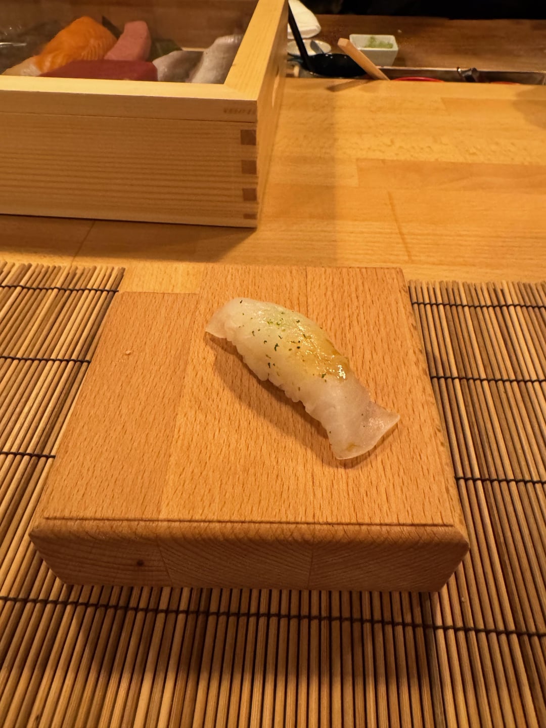 jcfleming 1 year ago Tried a new dinner omakase at Raw Omakase DC (above Takara 14) in Washington, DC and it was fabulous! These photos are just some of the courses I had.Chef Johnny was great and very hospitable and fun to chat with about the sushi. Highly recommend if you’re in the DC area.1 – hirame (flounder)2 – sumi ika (squid)3 – Faroe Island salmon4 – otoro (fatty tuna)5 – sanma (Pacific saury)6 – aji (Japanese horse mackerel)7 – engawa (flounder)8 – unagi (eel)