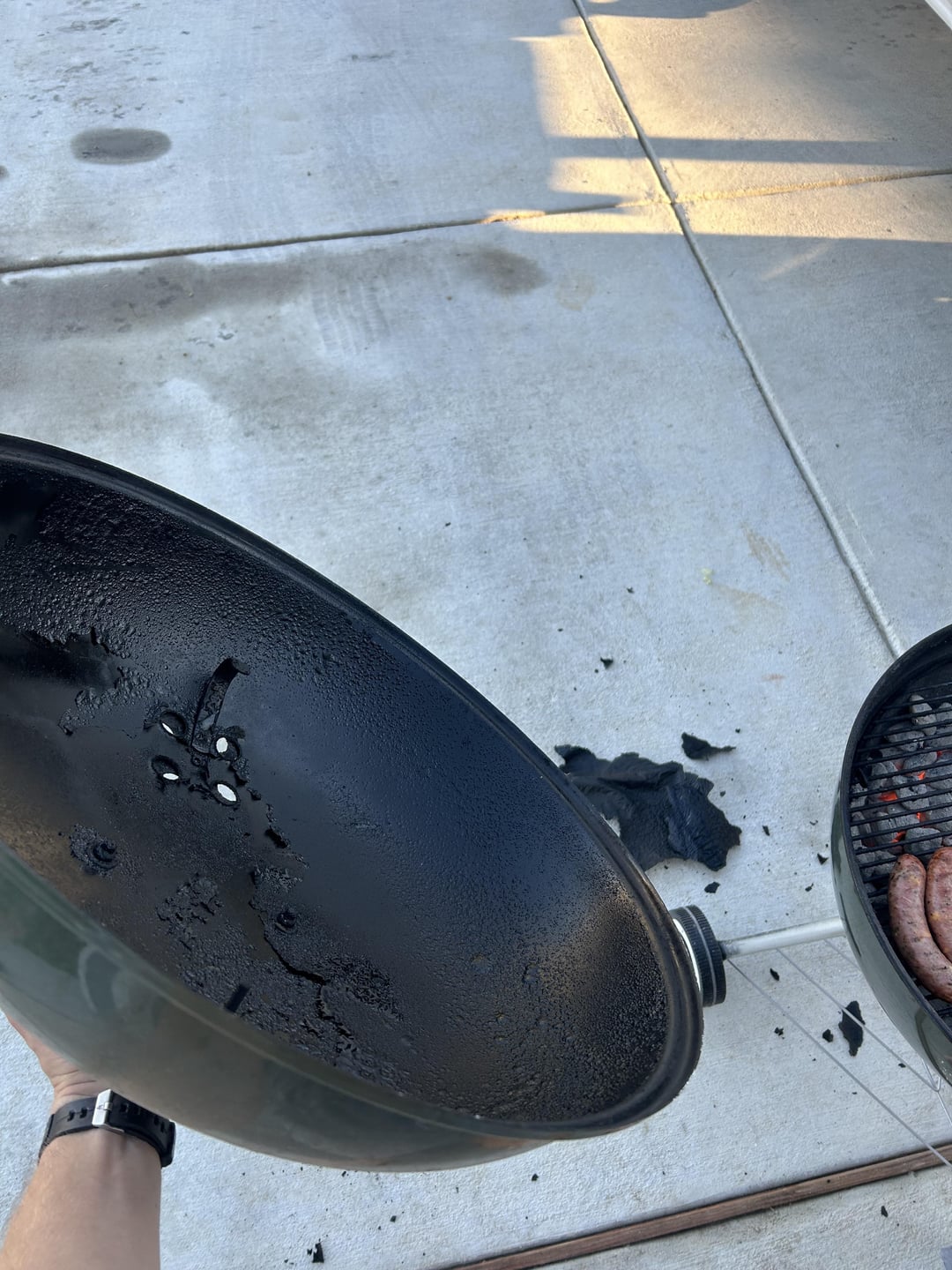 The inside surface of my kettle lid seems to be getting brittle and chipping off. Does this make the lid more prone to rust ? Also an obligatory picture of dinner.