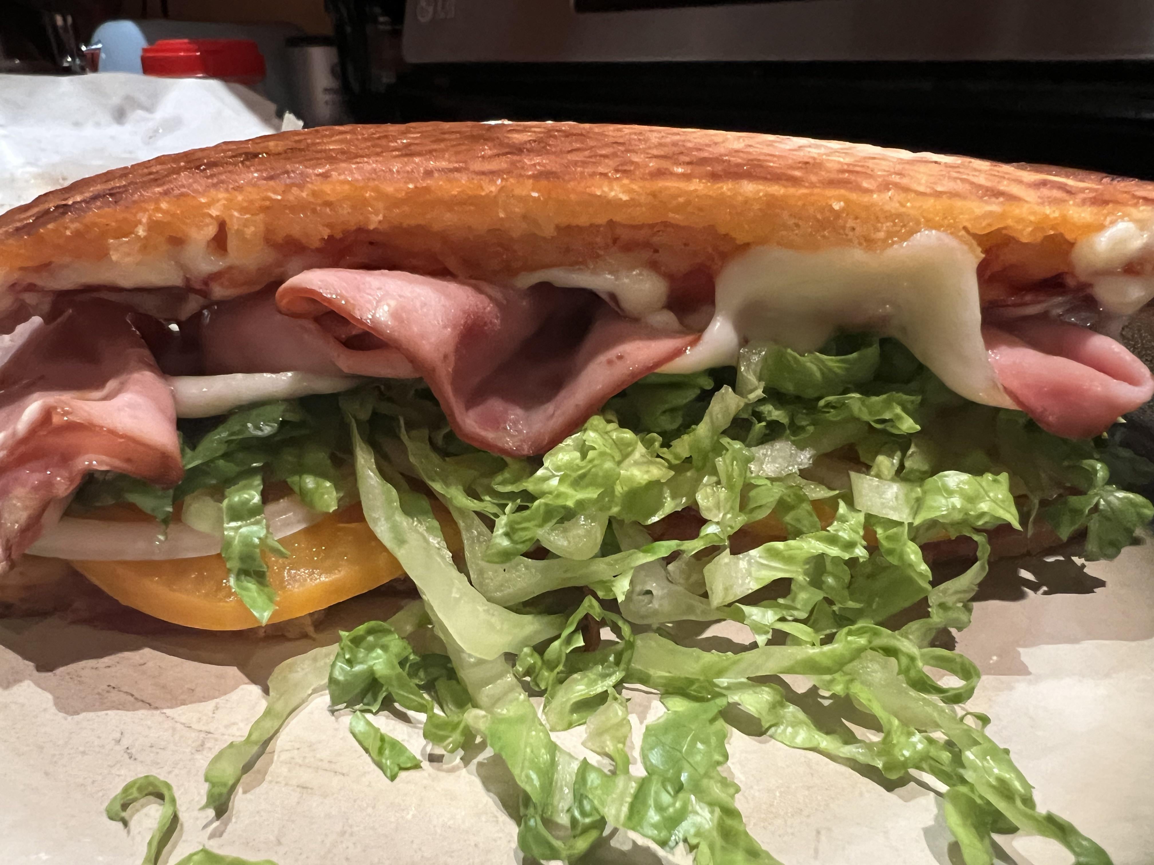Pepperoni pizza as bread, ham, provolone, lettuce, heirloom tomato, white onion, Olive Garden italian dressing