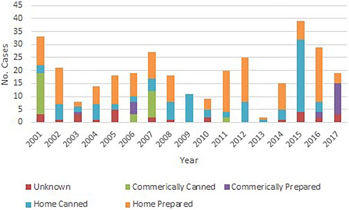 From 2001 to 2017 in the US there have been 326 confirmed cases of botulism from all sources. This resulted in 17 deaths and the median age of deaths was 76 years old (range 53-91 years).