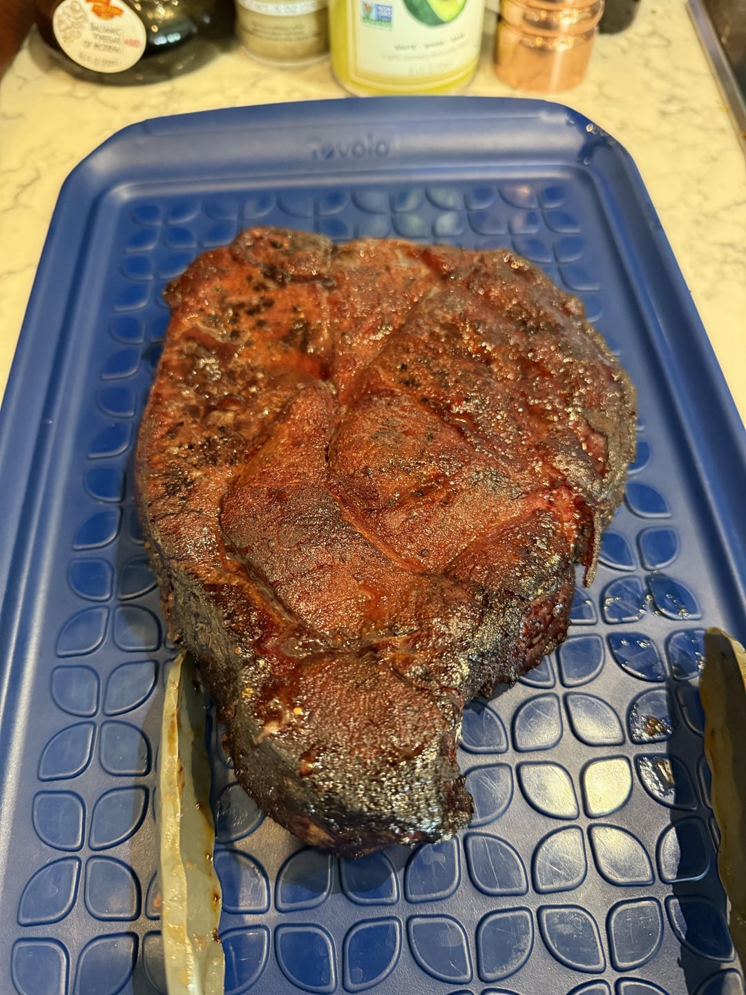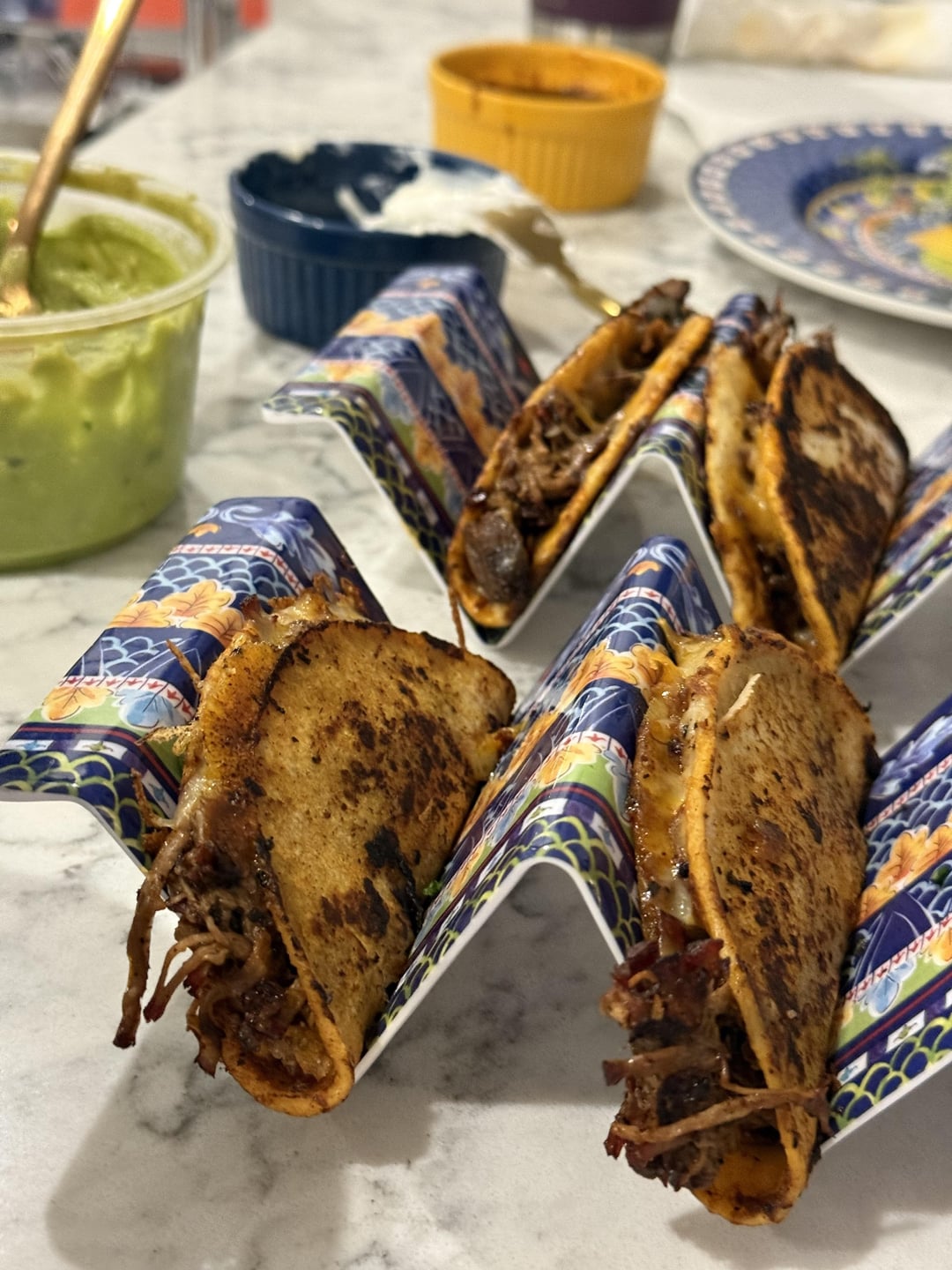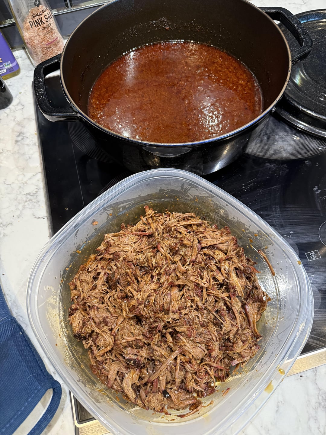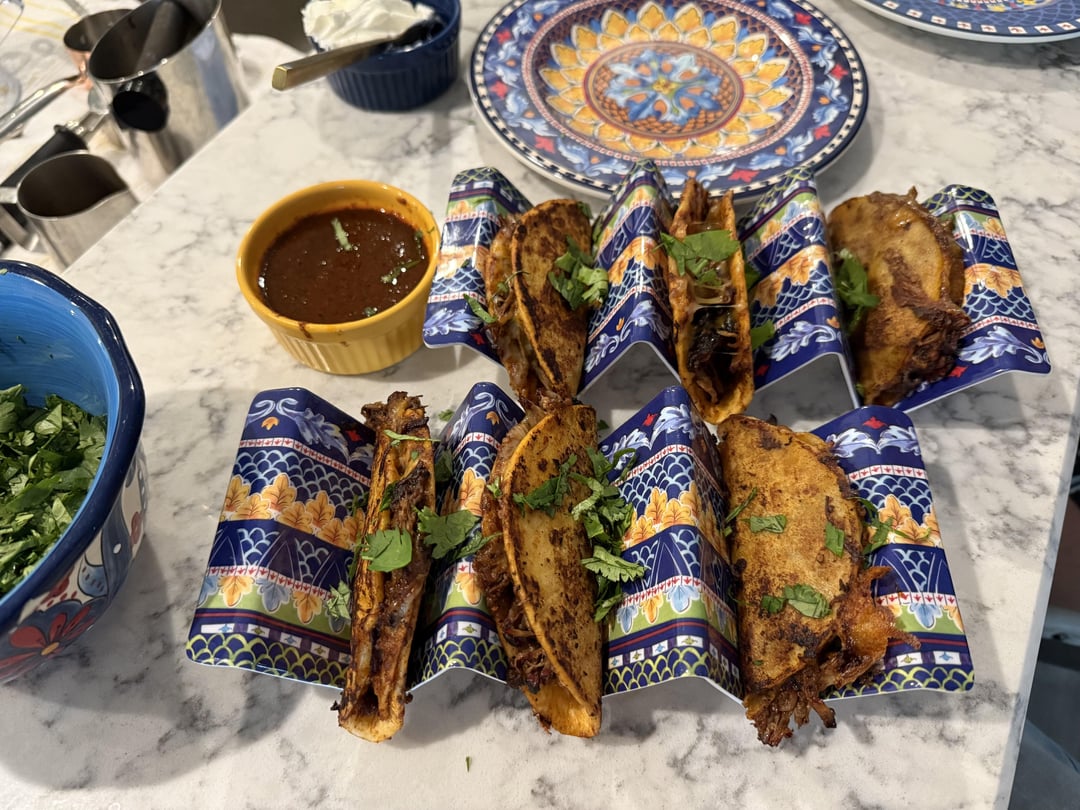 I made the barbacoa for tonight’s birria tacos using a chuck roast that I smoked over hickory and oak for 4 hours, then braised for 5 hours in a sauce I made with dried ancho and guajillo peppers, garlic, tomatoes, ginger, and spices 😋 Recipe from Meat Church. These were soooo good.