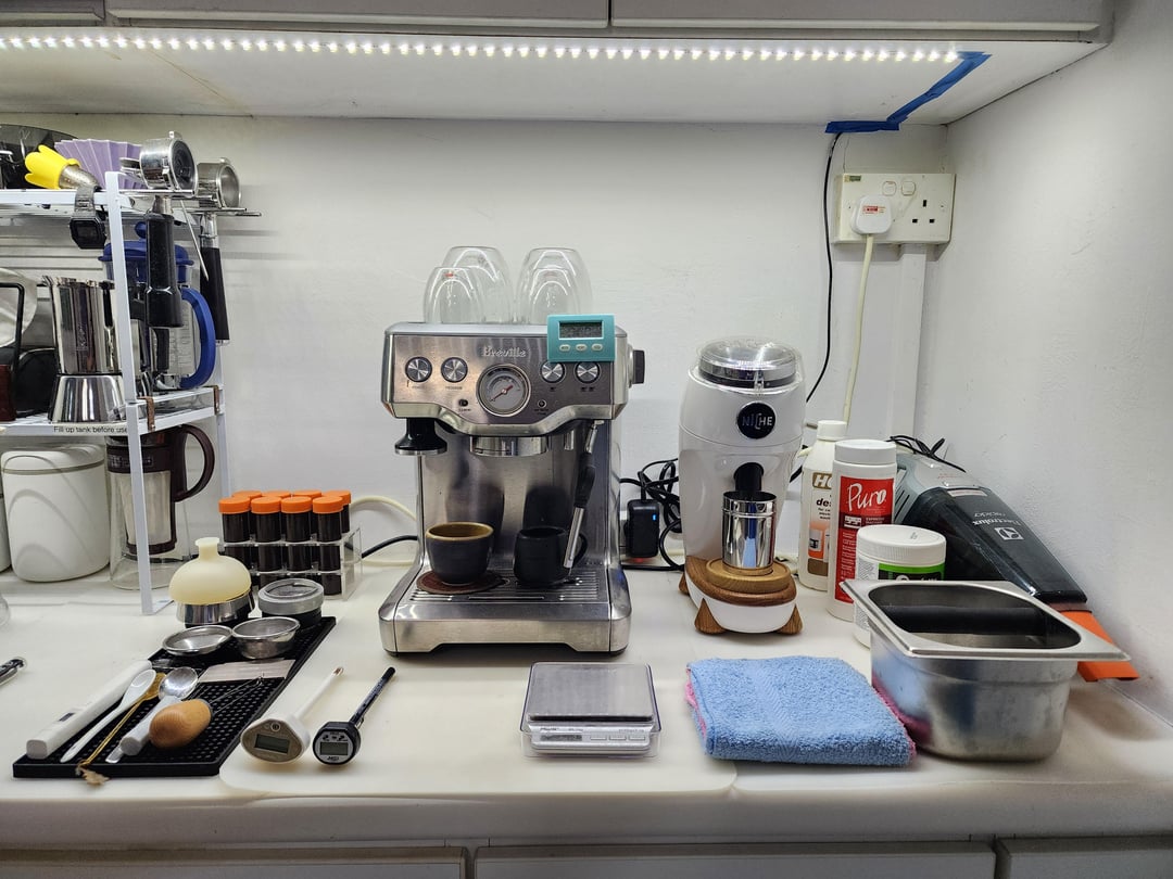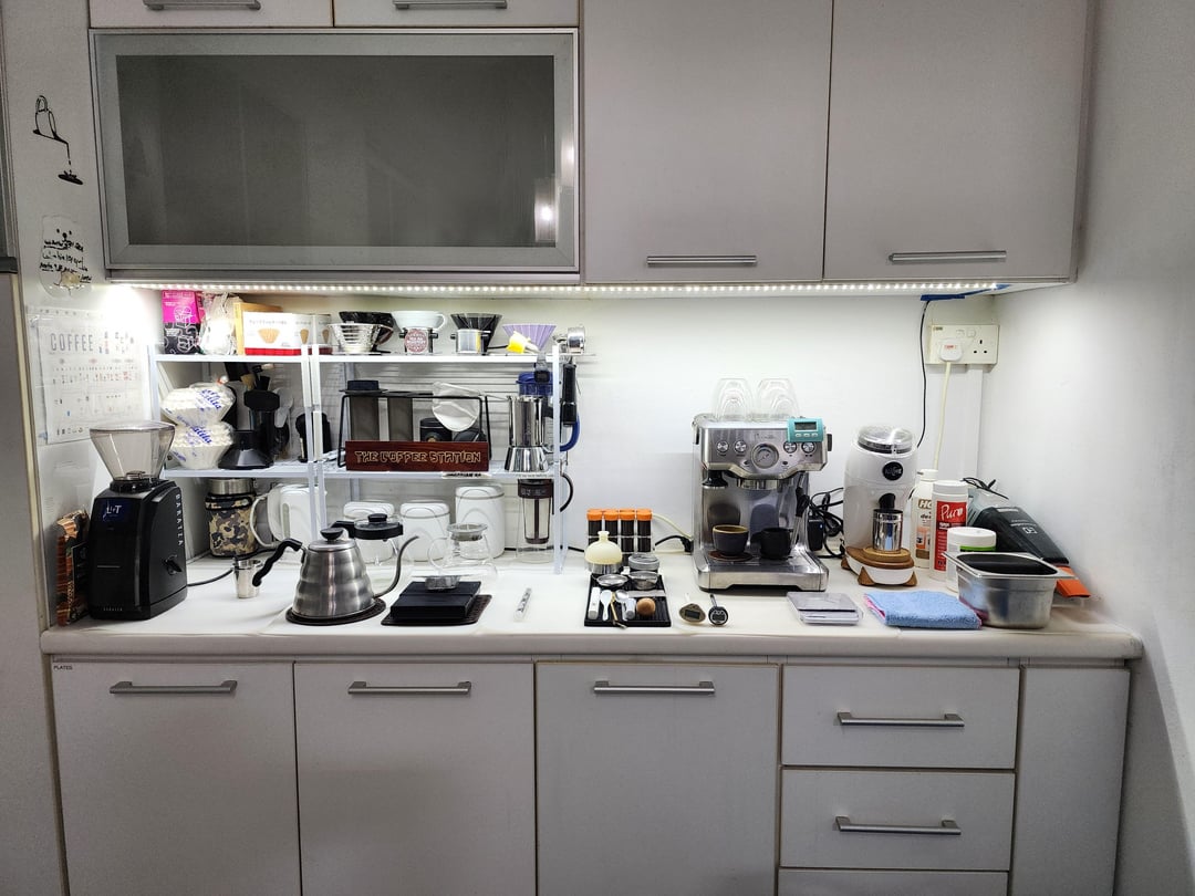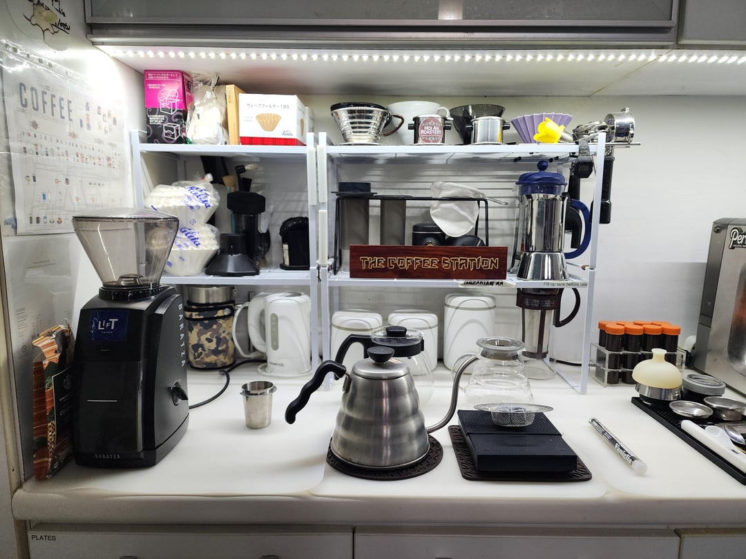 My station is divided somewhat evenly into two, with manual brewing methods on the left, and espresso on the right.