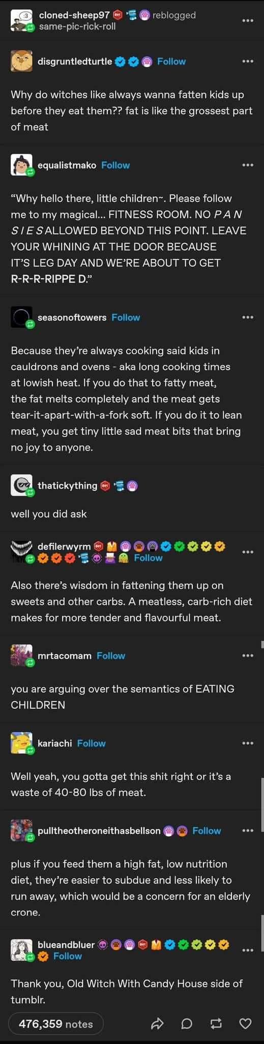 One person wonders why witches are always “fattening up” kids before cooking them, as they apparently like their children more on the lean side. As in, if someone were to cook the cast of “Stand By Me,” they would prefer Wil Wheaton over whoever the tubby kid in the striped shirt was.