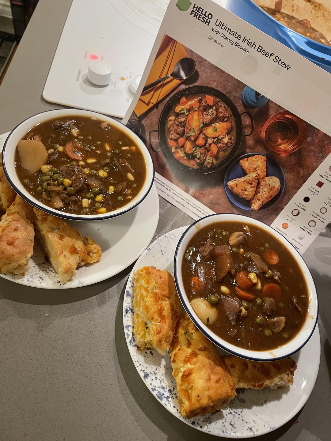 I was weirded out with it being ground beef, and I don’t think I paid attention to if it could be customized protein wise – but it was great. I always add things to these meals, this time our mirepoix was totally gross and rotten so I luckily had everything aside from celery on hand and they credited me for it. I did amp it up with extra potatoes so my partner has some for work tomorrow too – I’d go 8.5/10, and the biscuits were good too!