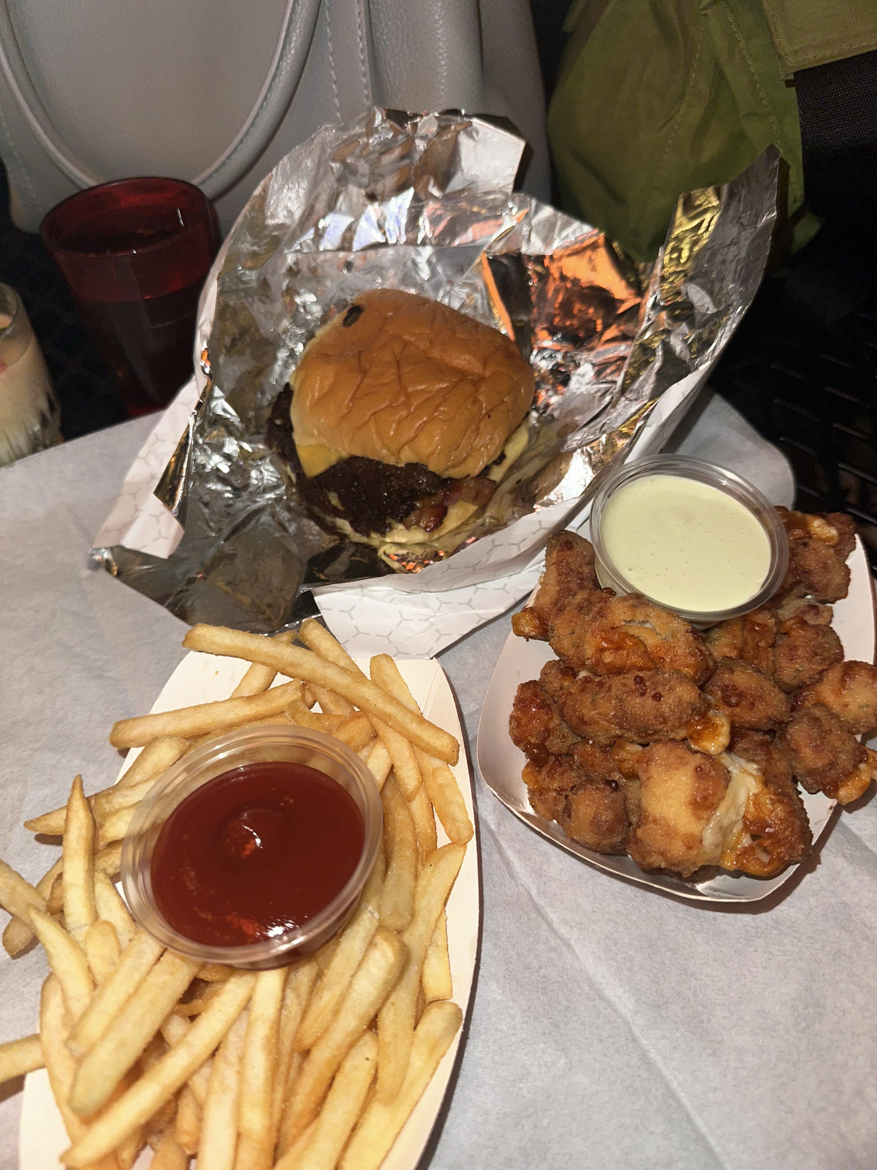 Went to small bar with some friends last night during their happy hour. Got their frozen banana daiquiri which was pretty good. Didn’t have a strong banana taste. I got the Pleaser with bacon, fries and the jalapeño cheese curds! All the food was served a bit over room temp which made sense because of how busy they were but serving room temp cheese curds has to be a crime! Overall, food was good. I think I will try them again when they’re less busy but for the price, I wasn’t disappointed!