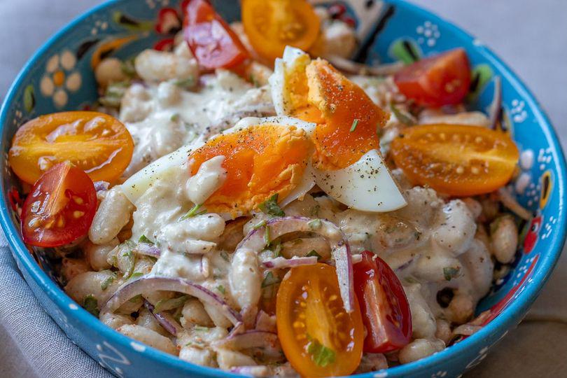 Fasulye Piyaz: white beans, onions, tomatoes, eggs, and parsley all tossed in mix of tahini, lemon juice, and olive oil by sweety_bella Write A CommentYou must be logged in to post a comment.