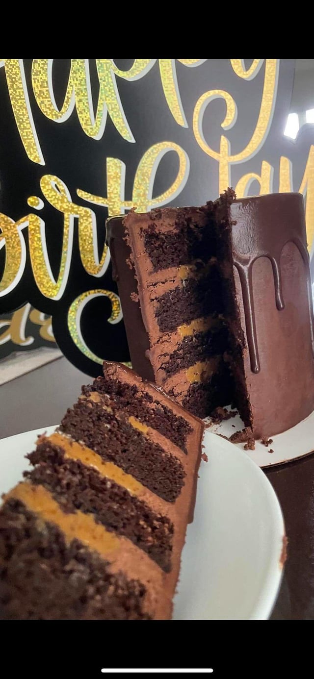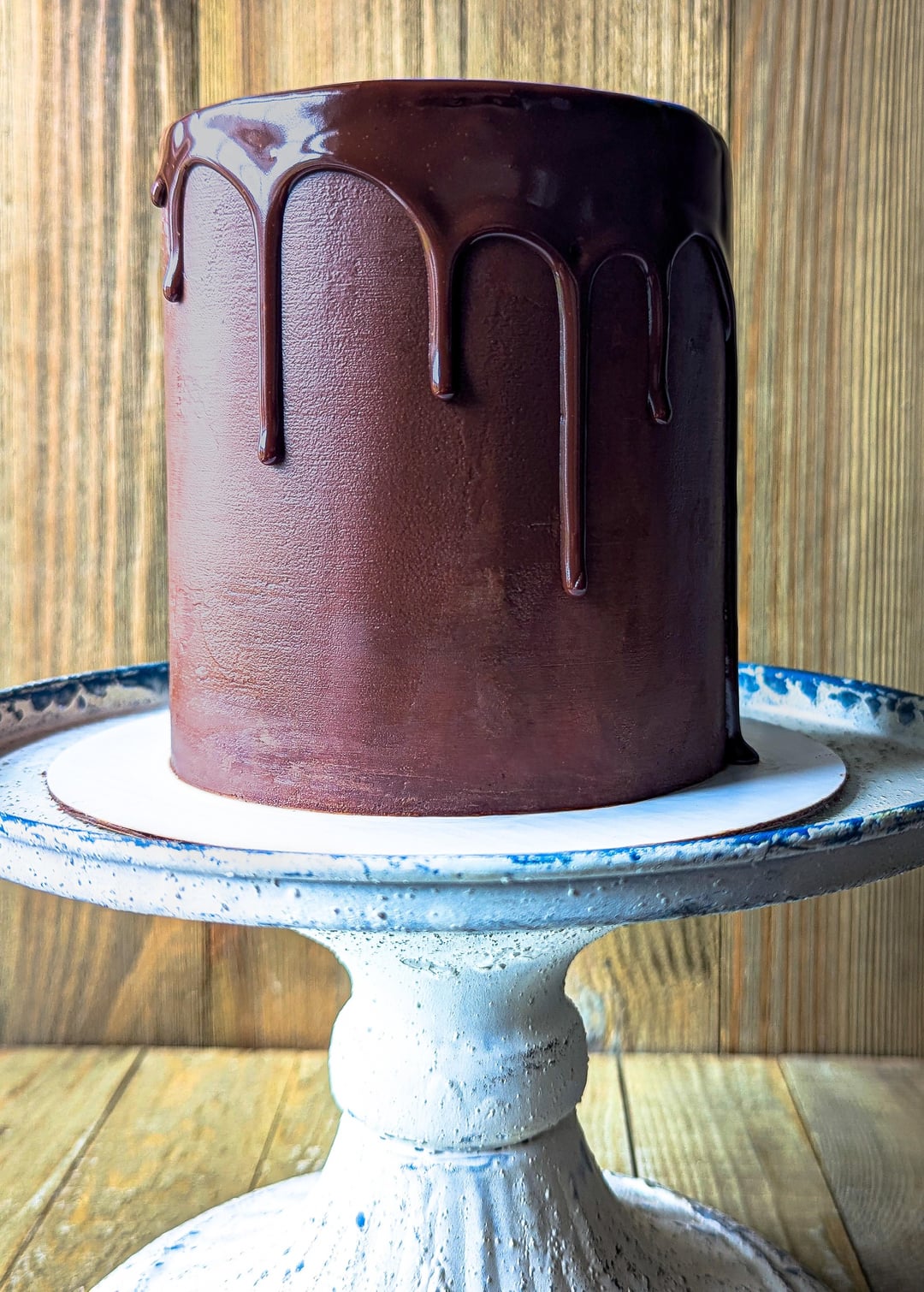 Chocolate cake, with dulce de leche filling, whipped chocolate ganache frosting and dark chocolate ganache drip.
