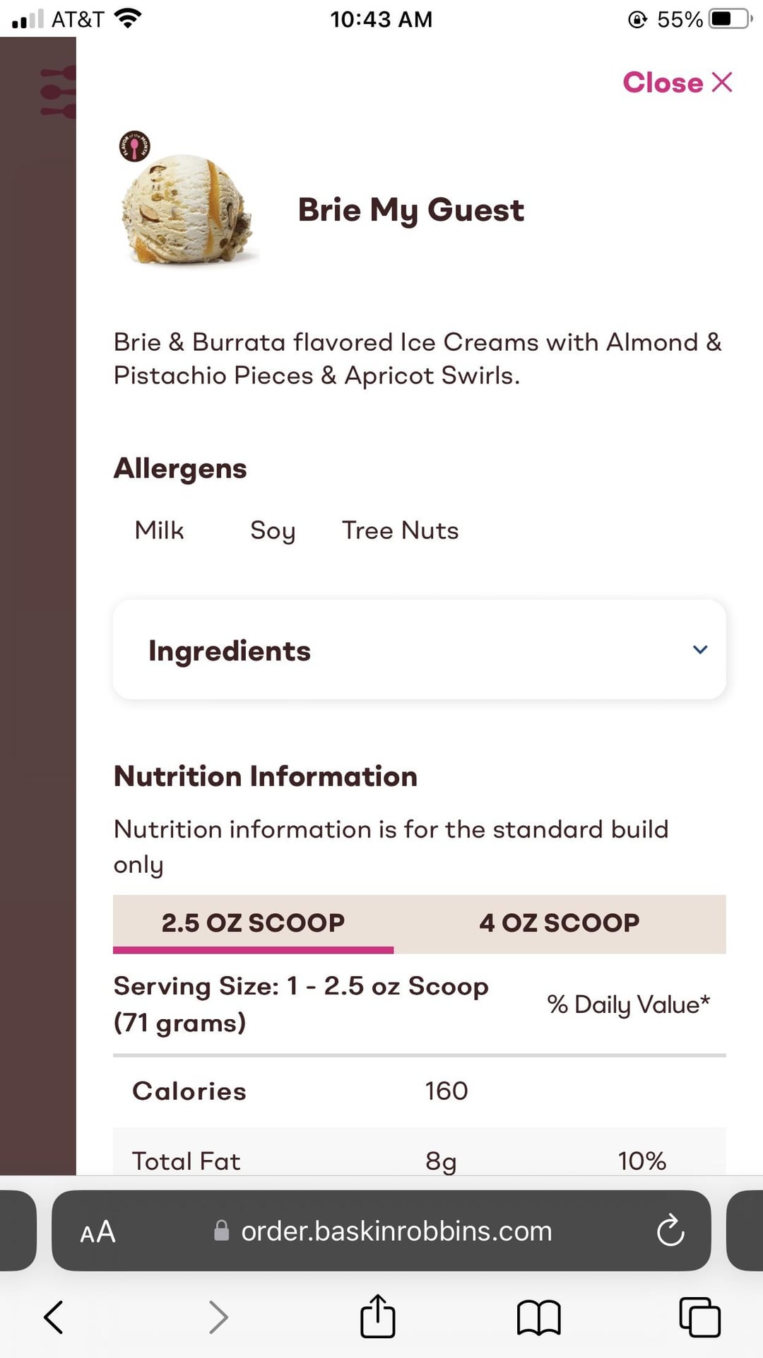 “Brie My Guest: Brie & Burrata flavored Ice Creams with Almond & Pistachio Pieces & Apricot Swirls.”