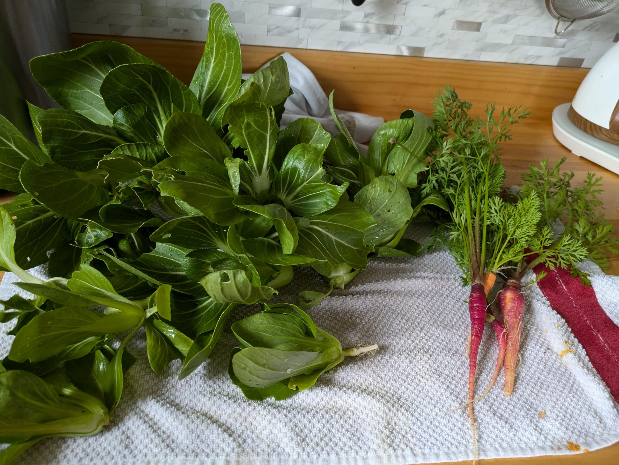 After the toddler ate about 10 cherry tomatoes outside, the kids finished off the rest inside while I cleaned the carrots. They ate the 2 properly thick orange carrots and the small yellows while I cleaned the choy. The dog got a red thick carrot. This is what they've left for my husband and I to pair with lamb for dinner tonight.