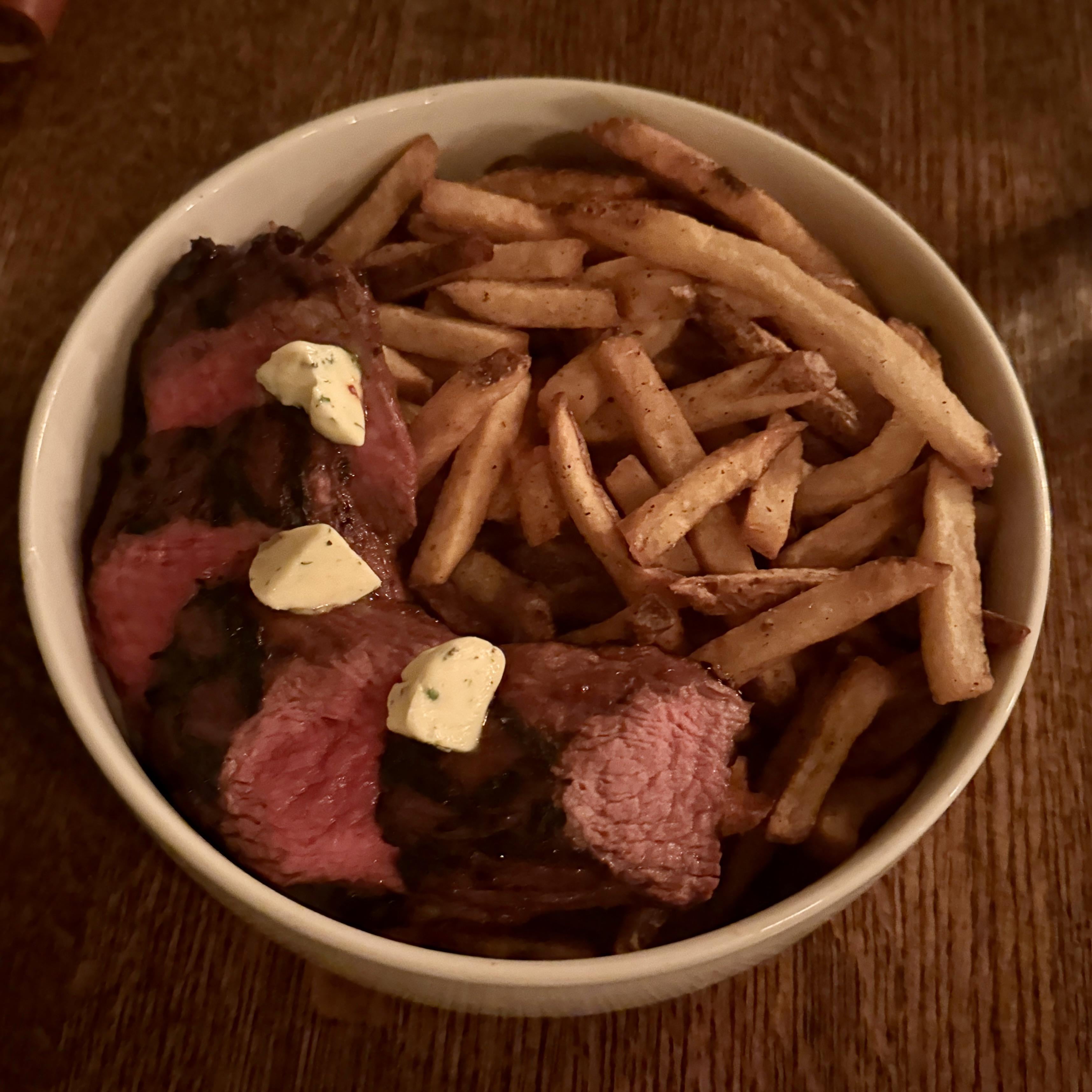 Steak served in a deep bowl on top of fries. Had to ask for a plate so I could actually cut it. π€¦π»