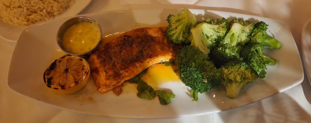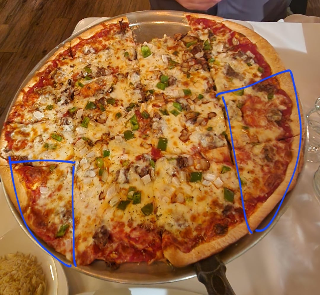 The salmon was like 8 ounces I'm guessing. The pizza was an extra large beef roast pizza with green peppers and onion. I had the 3 slices outlined poorly in blue. The crust was pretty thin. It's a lot but this was a dinner with my dad and we don't go out to restaurants for dinner too often so I thought I'd just enjoy it to the fullest