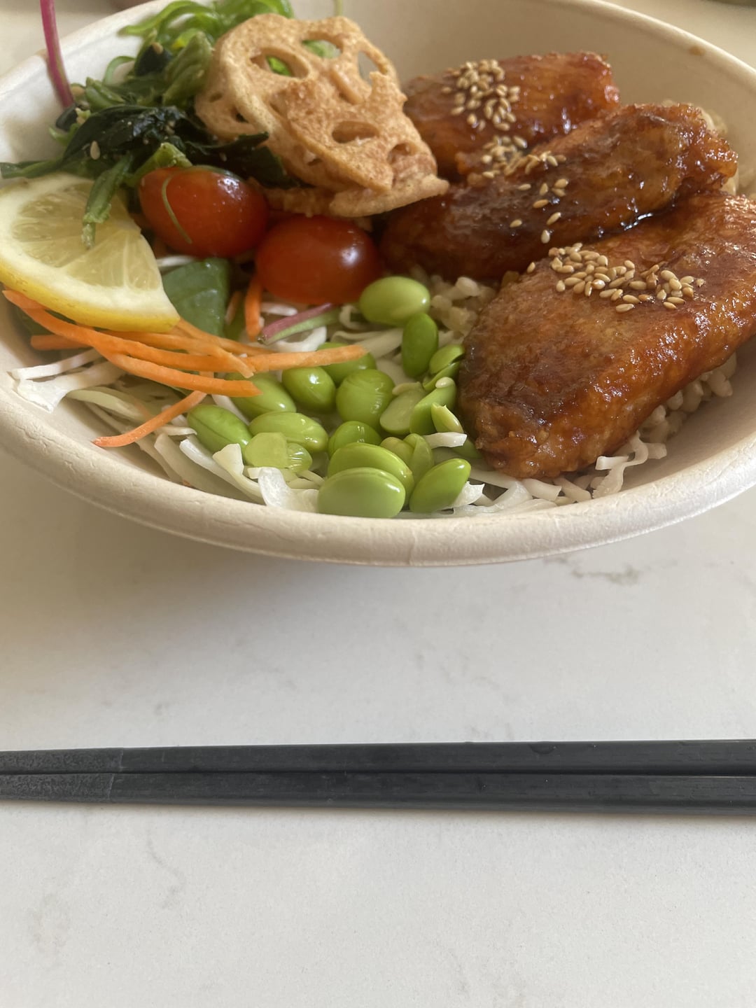 This bowl had teriyaki salmon, seaweed salad, spinach, mixed leaves, cabbage and some edamame.