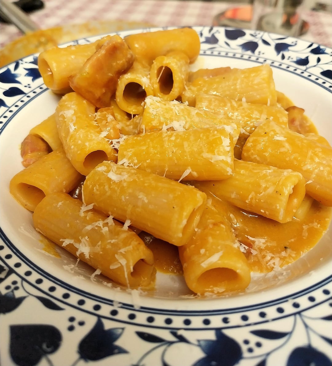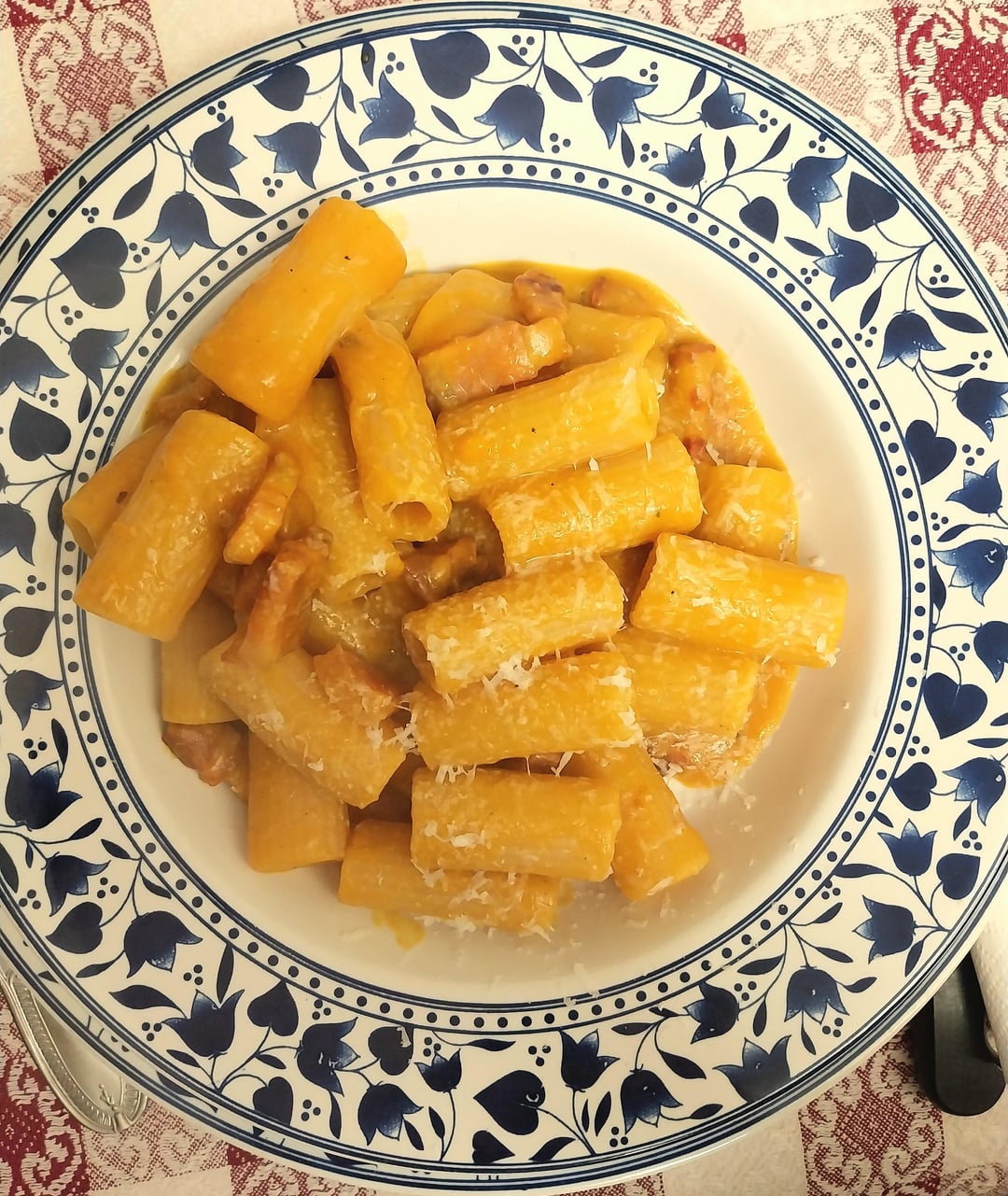 I used: pumpkin (cooked in the oven then blended), pecorino romano cheese and guanciale. I added some pasta water to create the sauce and the consistency was perfect! I guess you can imagine what I took inspiration from but I'm scared someone would come at me if I said it out loud lol🤣 either way it was delicious!