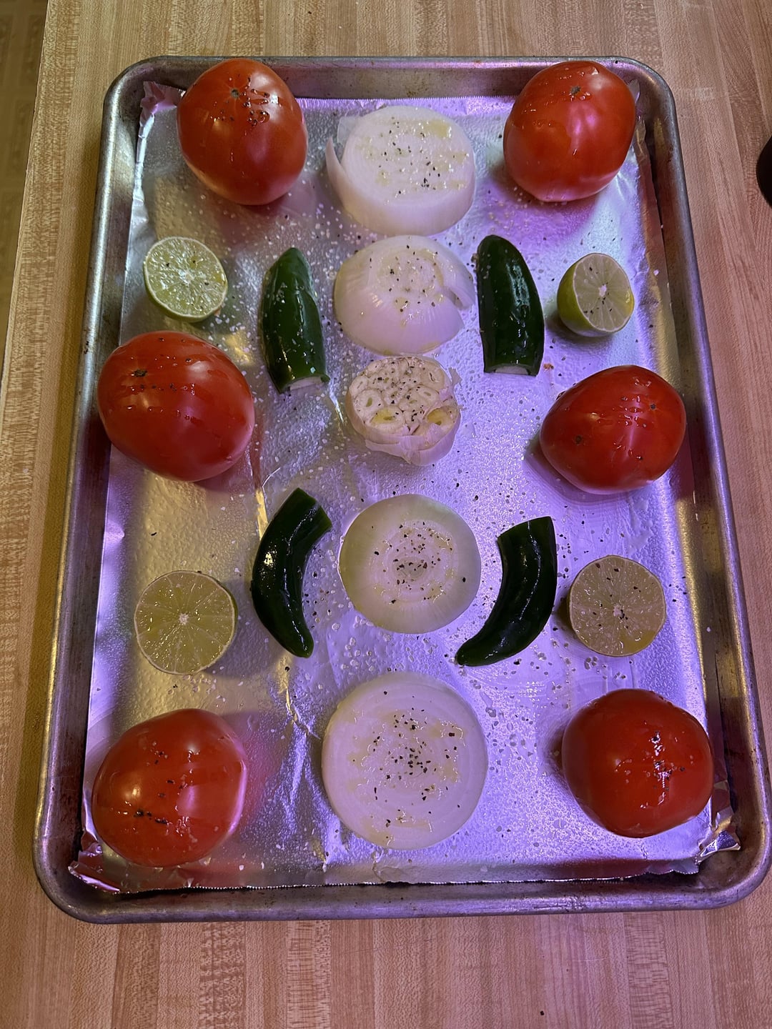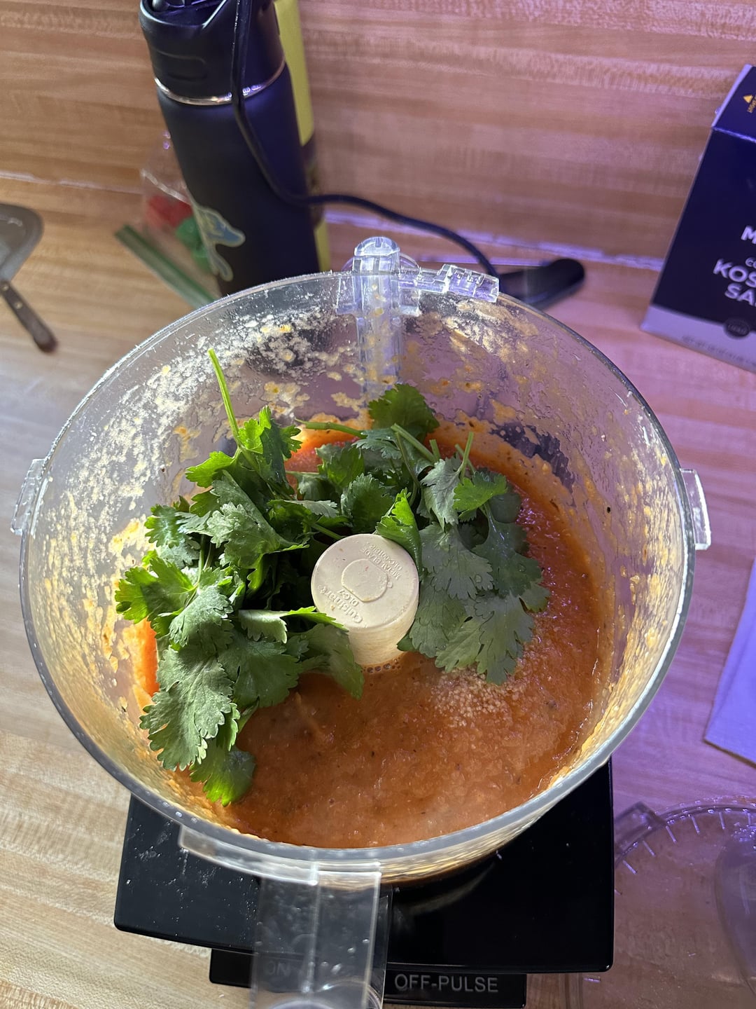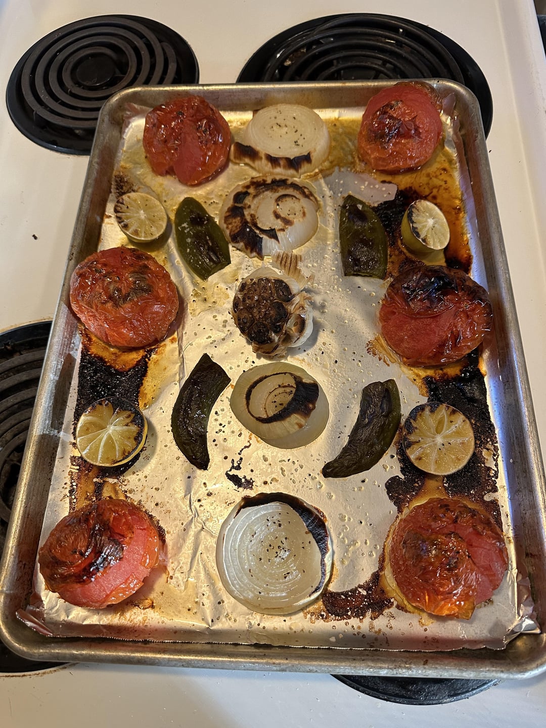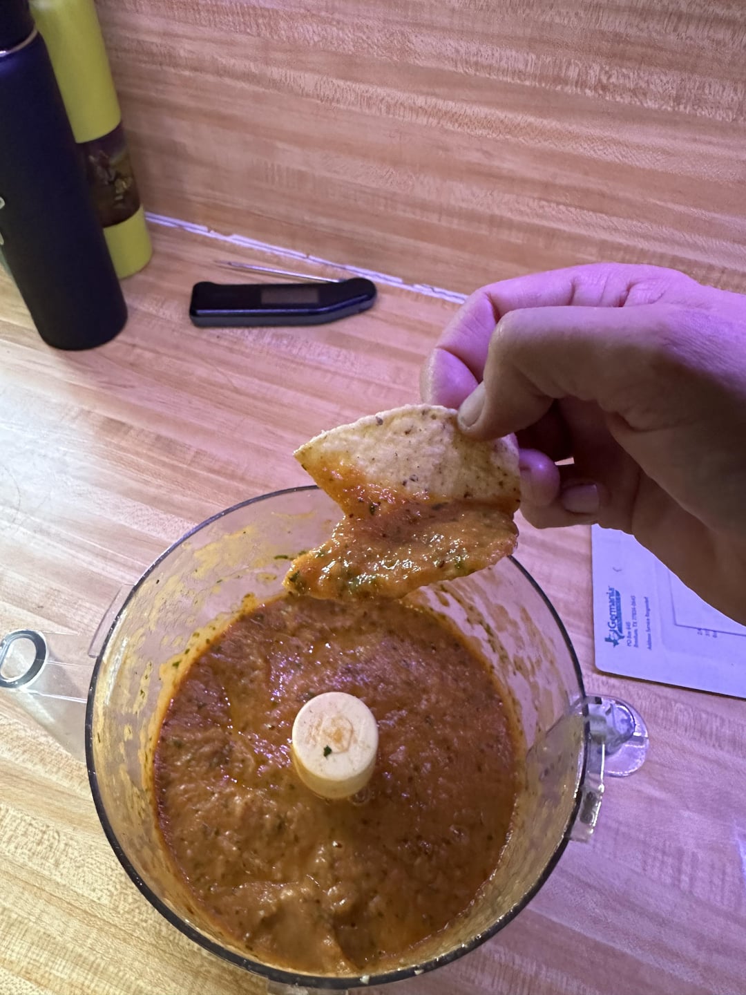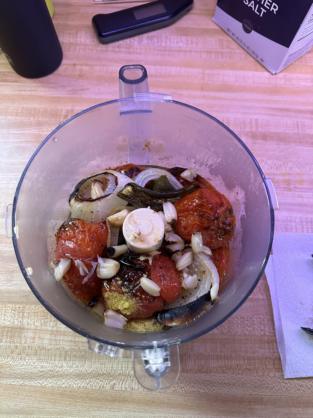 Pretty basic I’ll admit but I’m proud of how it turned out and wanted to say thanks to everyone on here for sharing and inspiring me to make one. 6 unknown red tomatoes that were given to me, 2 jalapeños halved with seeds, 2 limes halved, 1 white onion sliced into 4 pieces, 1 whole bulb of garlic. Everything was tossed in olive oil and toasted at 450f for 20ish minutes, then broiled for 5-7 minutes until charred. Then into the food processor with 2 tsp of better than bouillon chicken, 1tbsp olive oil, salt and pepper to taste and a fist full of cilantro.