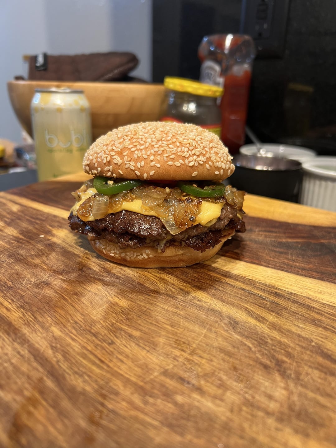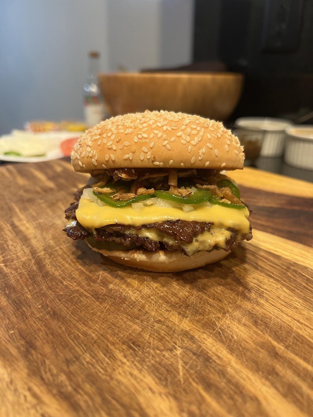 Double smash with Kraft Deli Deluxe “sharp cheddar,” grilled jalapeno, diced white onion, crispy onions, pickles, and honey chipotle BBQ sauce on a toasted Big Marty