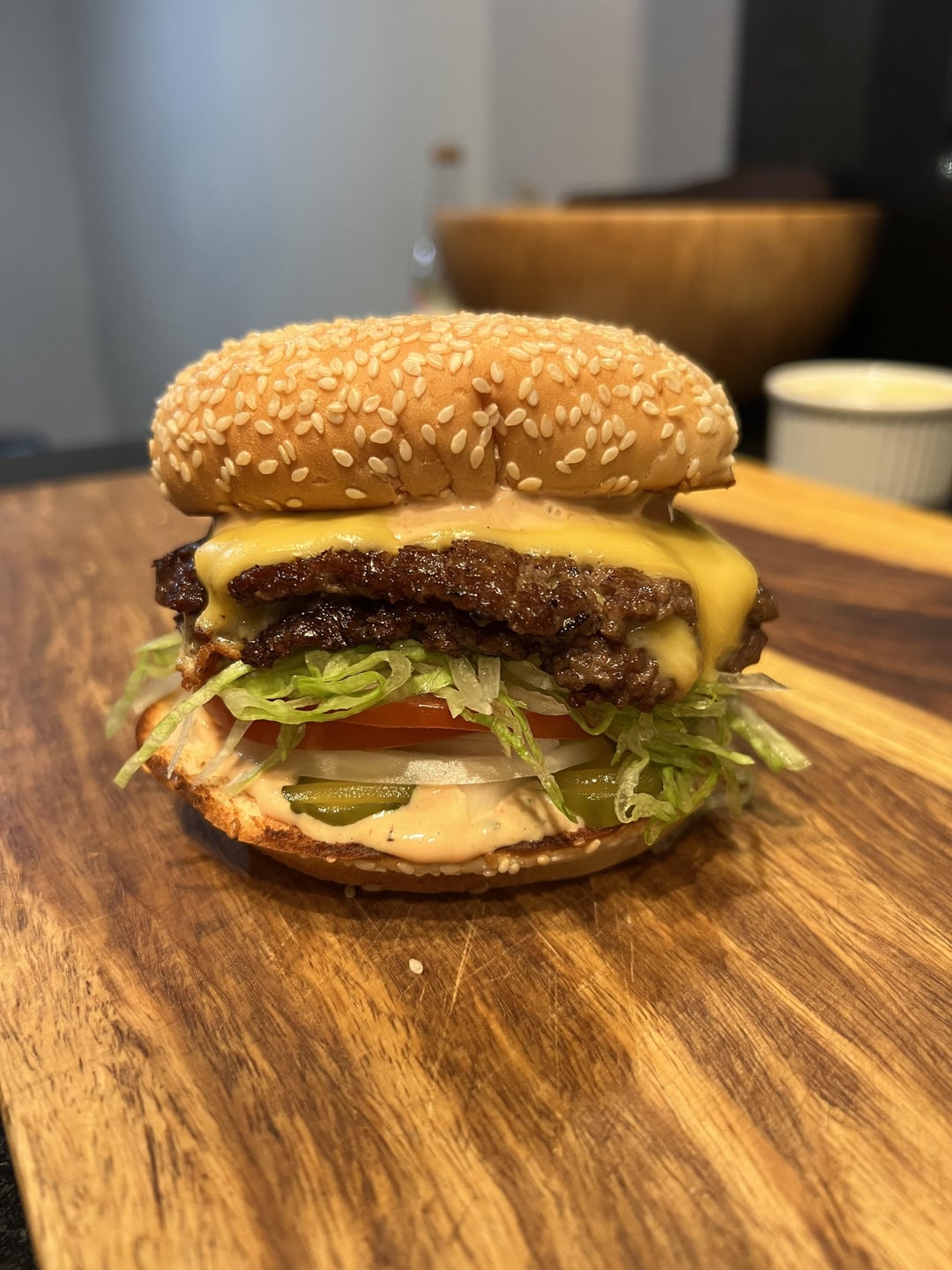 Classic double with American, L/T/O/P, and burger sauce on a toasted Big Marty