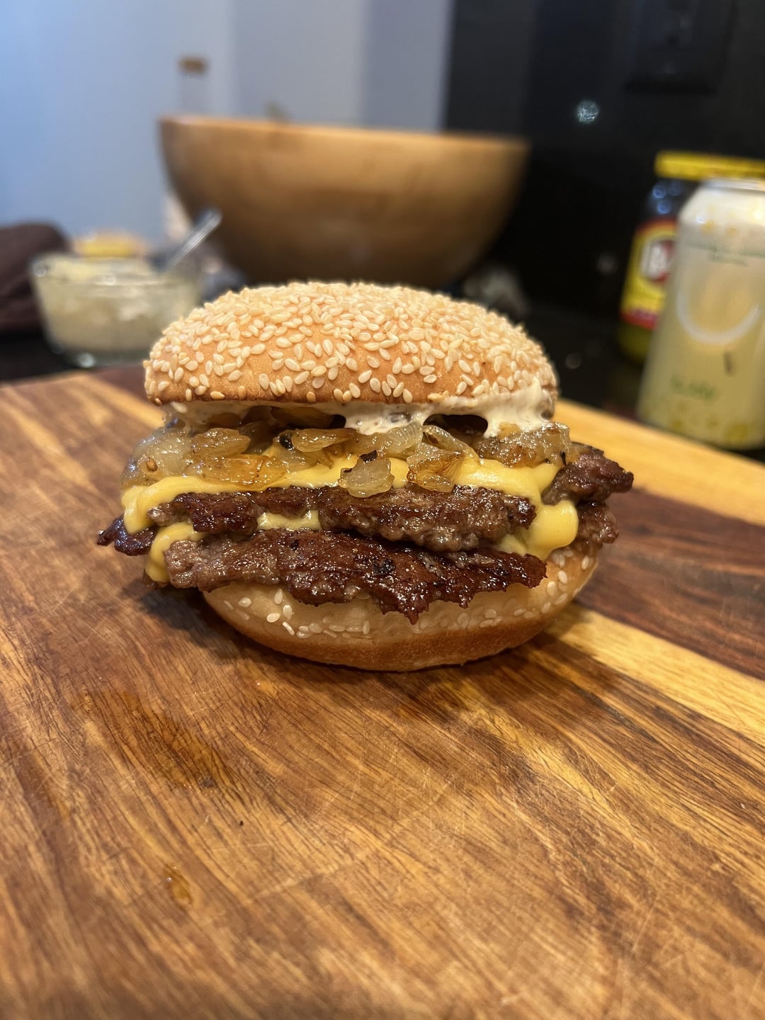 Double smash with caramelized onions, Kraft Deli Deluxe “sharp cheddar,” and a malt vinegar dijonnaise on a toasted Big Marty