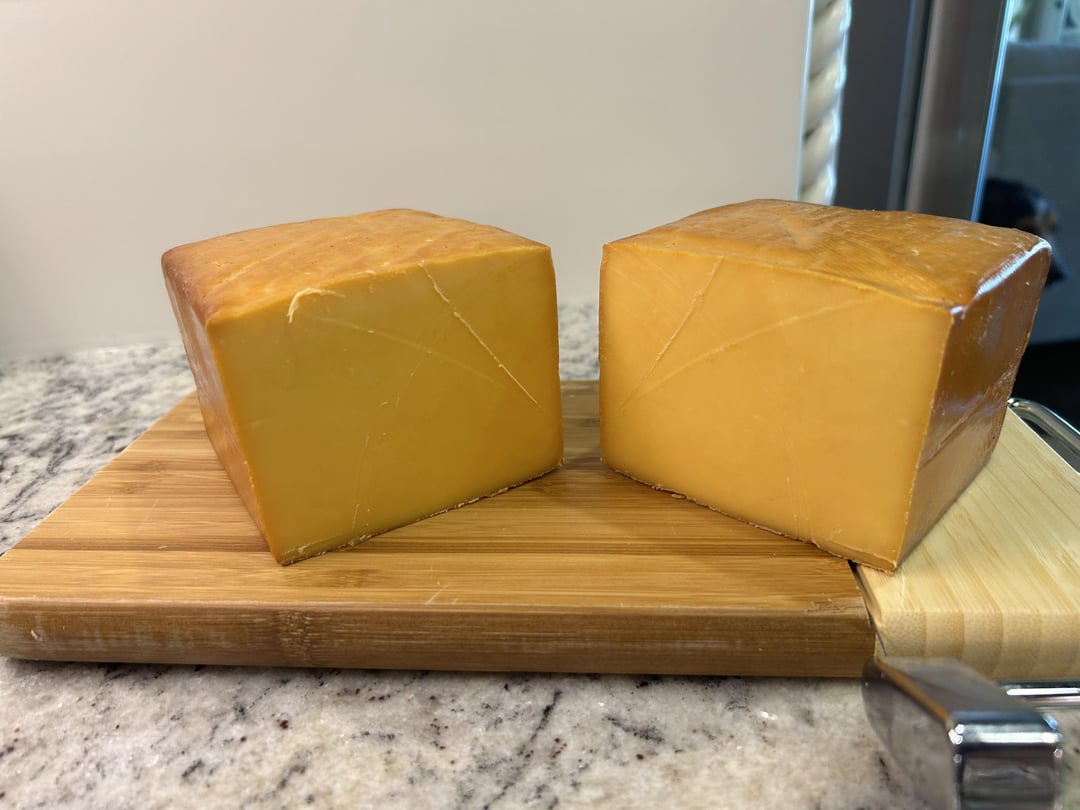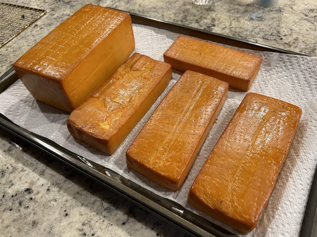 About 4 weeks ago I cold smoked some pieces of medium cheddar for 12 hrs on my smoker with apple pellets. Then I wrapped all of the pieces in butcher paper for 48hrs and then vacuum sealed them so the smoke can mellow out. The first two pictures are right after the smoke and the second two are from today after about 4 weeks of mellowing out while vac sealed.