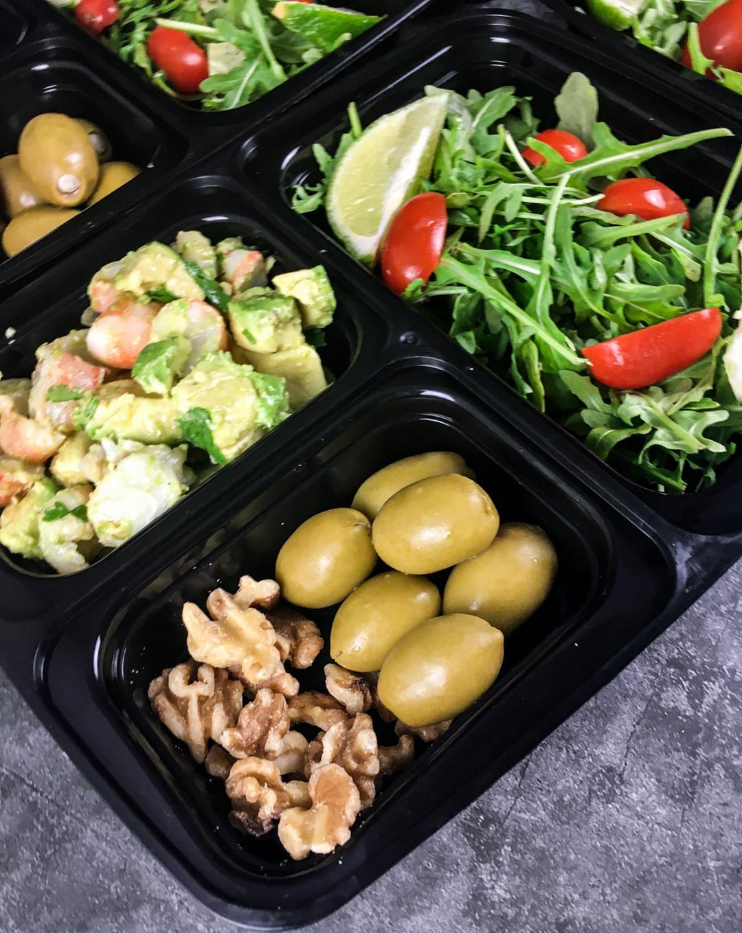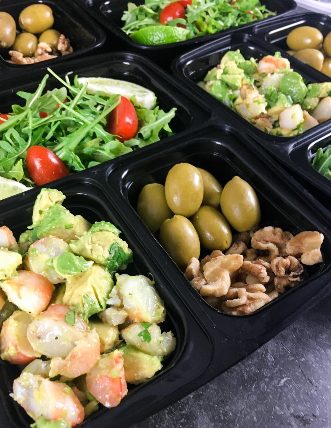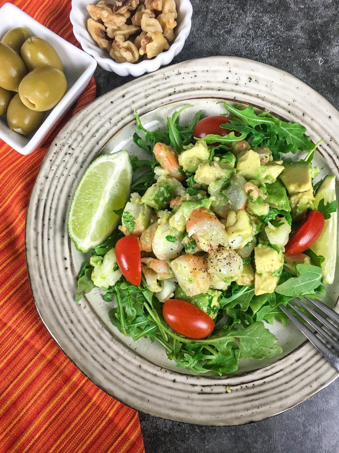 Divide the baby arugula between four meal prep containers or serving plates. Add one-fourth of the avocado shrimp mixture to each container or plate. Evenly divide the green olives, walnuts, and lime wedges between each portion. Serve immediately or refrigerate for later. Enjoy!