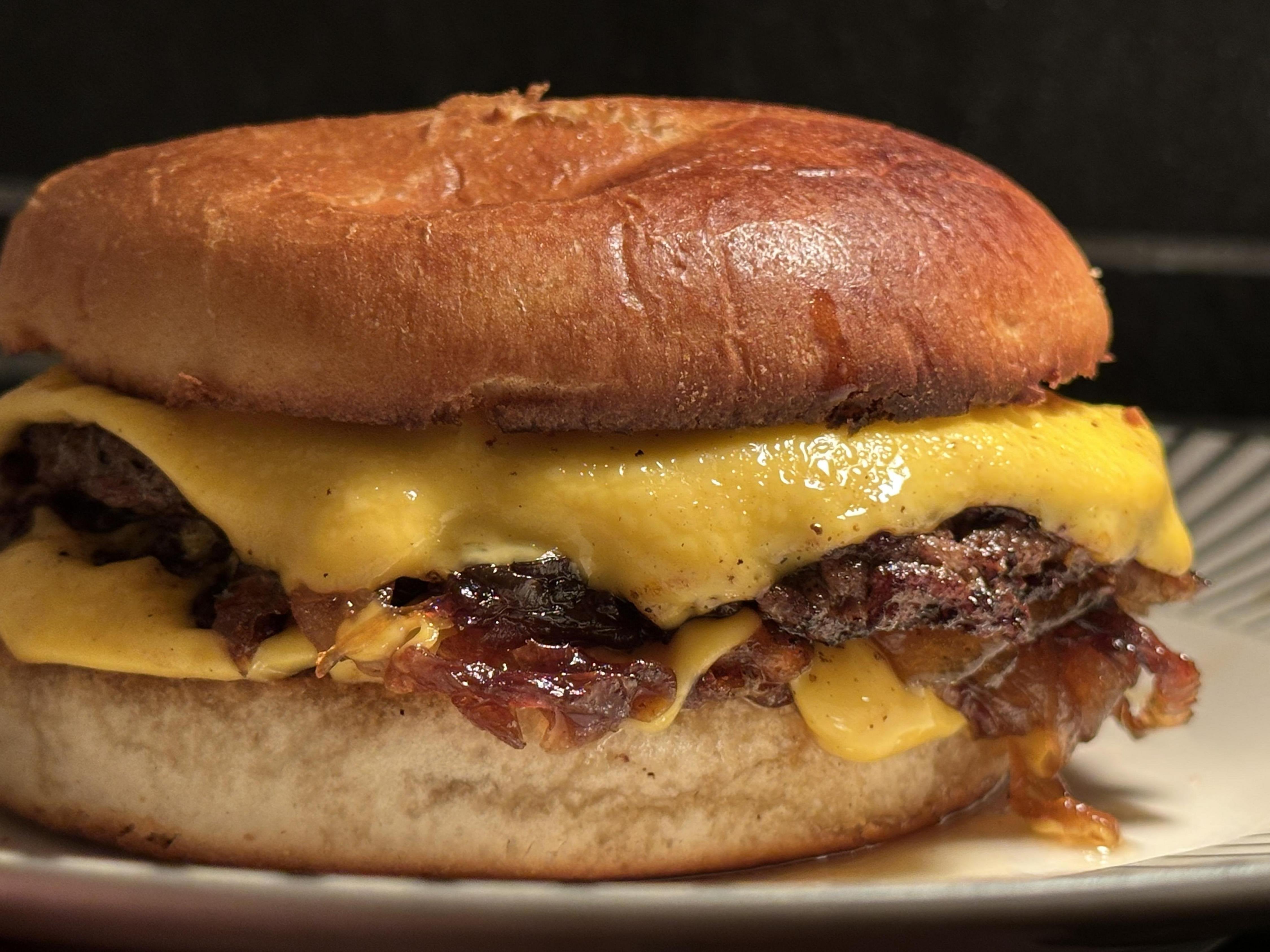 2x 60 gram patties, caramelized onions, double cheddar and fried in mustard. Simple and tasty.