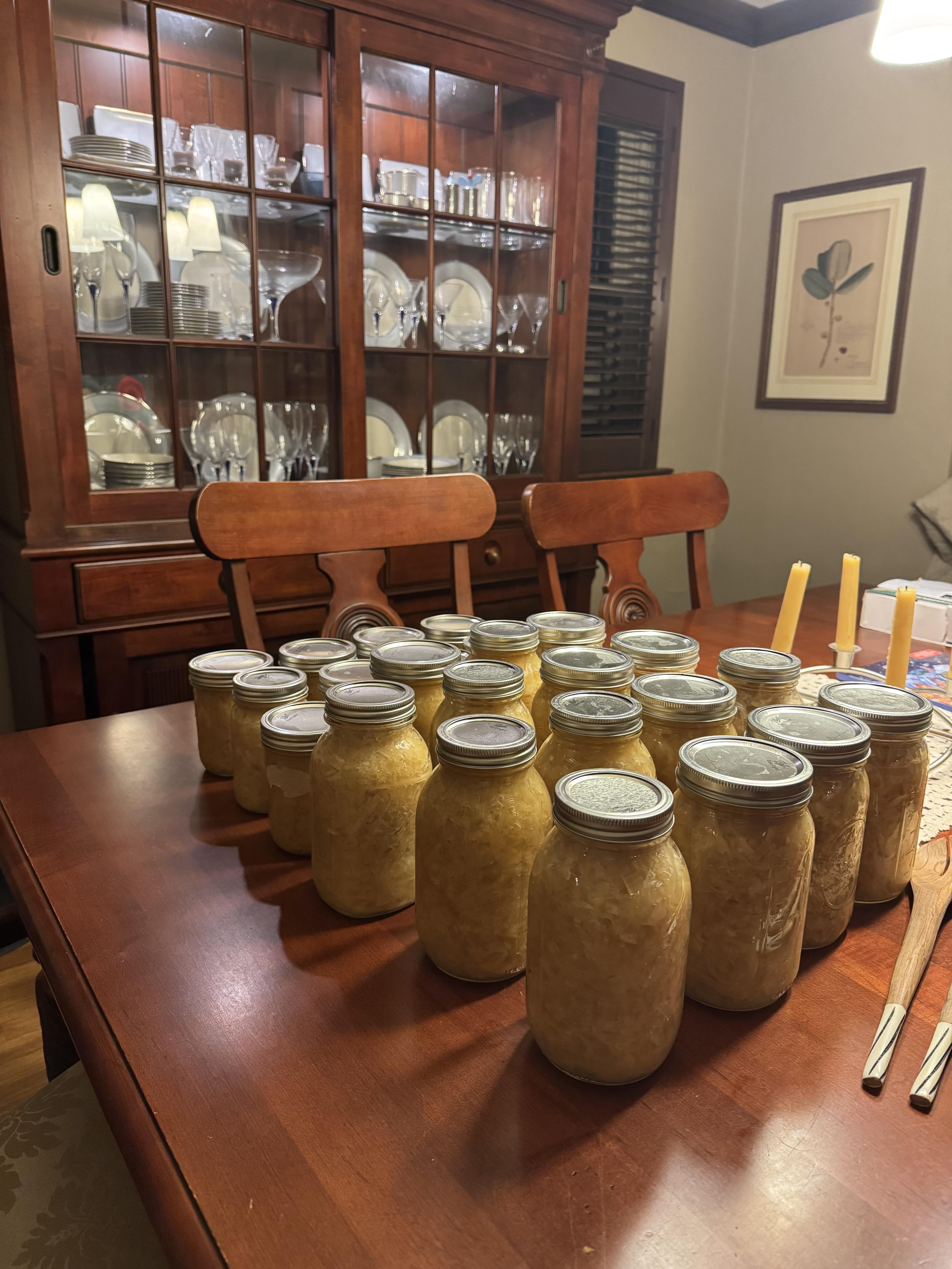 We shredded cabbage back in September and it fermented in the basement. I canned all 50 pounds with Balls simple recipe this afternoon. Just need help finding strong gift bags 😁