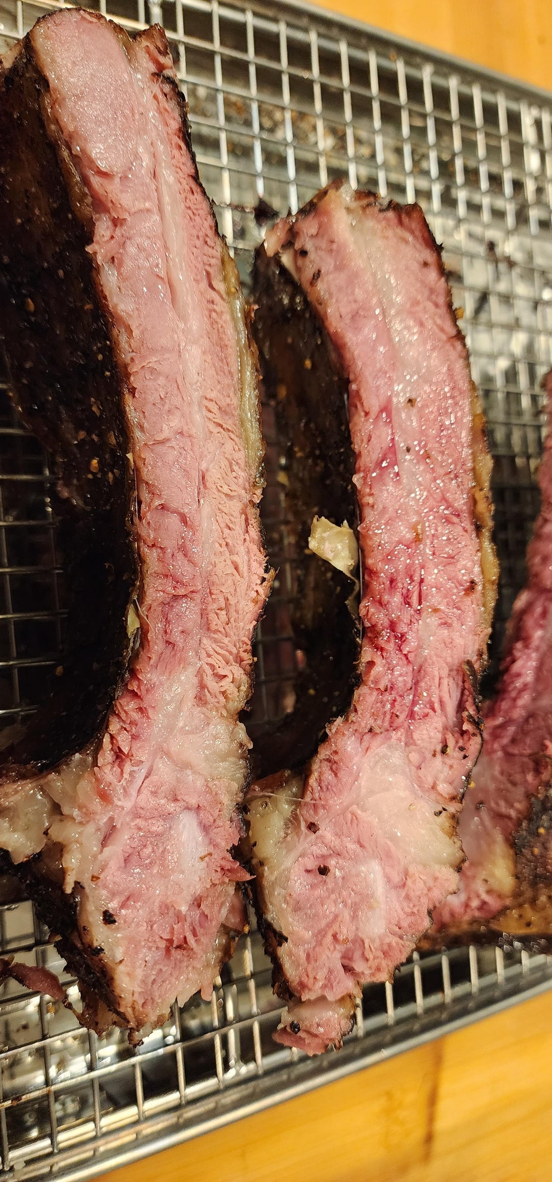 So, I used to do beef ribs at 132f for 12-24 hours followed by a sear in the grill, indirect as hot as I could get it (650 or do) for at most 10 minutes. That would give me a nice medium rare steak-like result. This time I was hoping to render more fat and soften the collagen morr, so I bathed at 140f for 24 hours, dusted with SPOG and smoked at 225 for two hours. I was afraid I'd dry them out smoking for two hours, but not so. Tasted great, good bark, but it was pinker than I expected. I'll probably go 150f next time. Good progress, though.