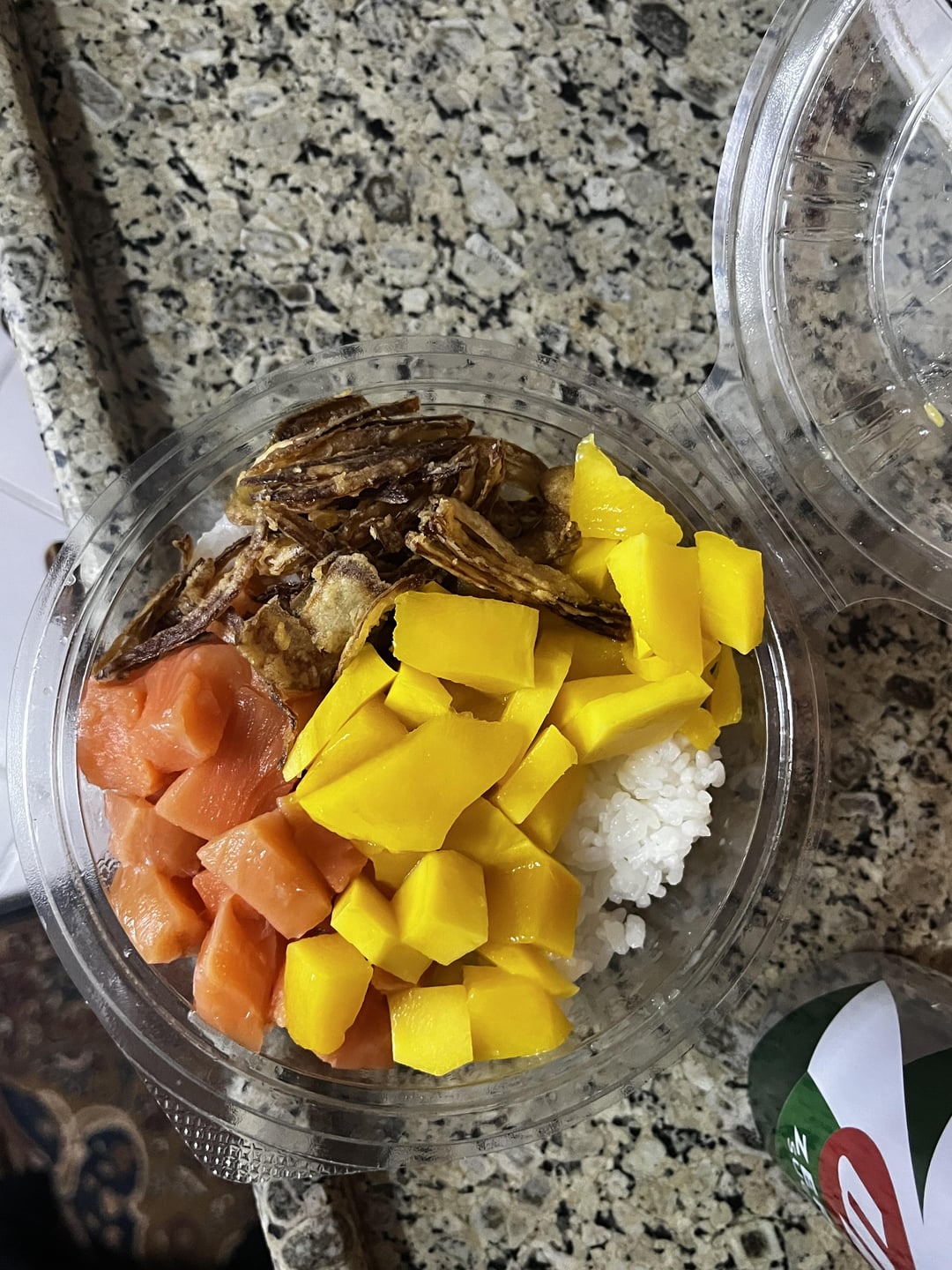 how many calories do we think it is? white rice, salmon, mangoes, and crispy onions. with spicy mayo sauce and the seven up is for size reference!! thank you ❤️