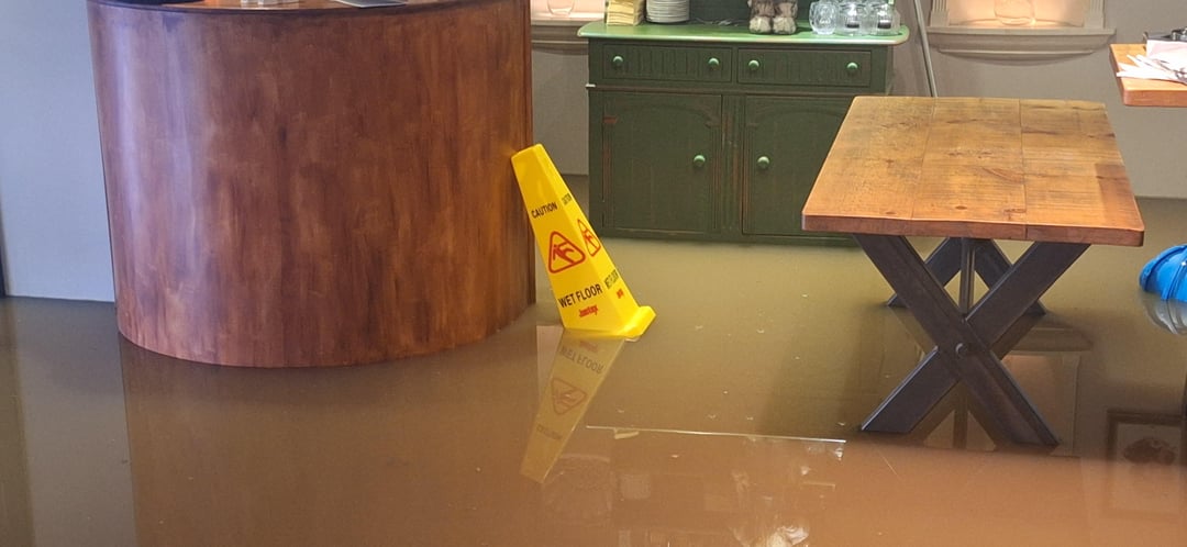 Update: the kitchen is now fully flooded. Finishing up breakfast service with wet ankles